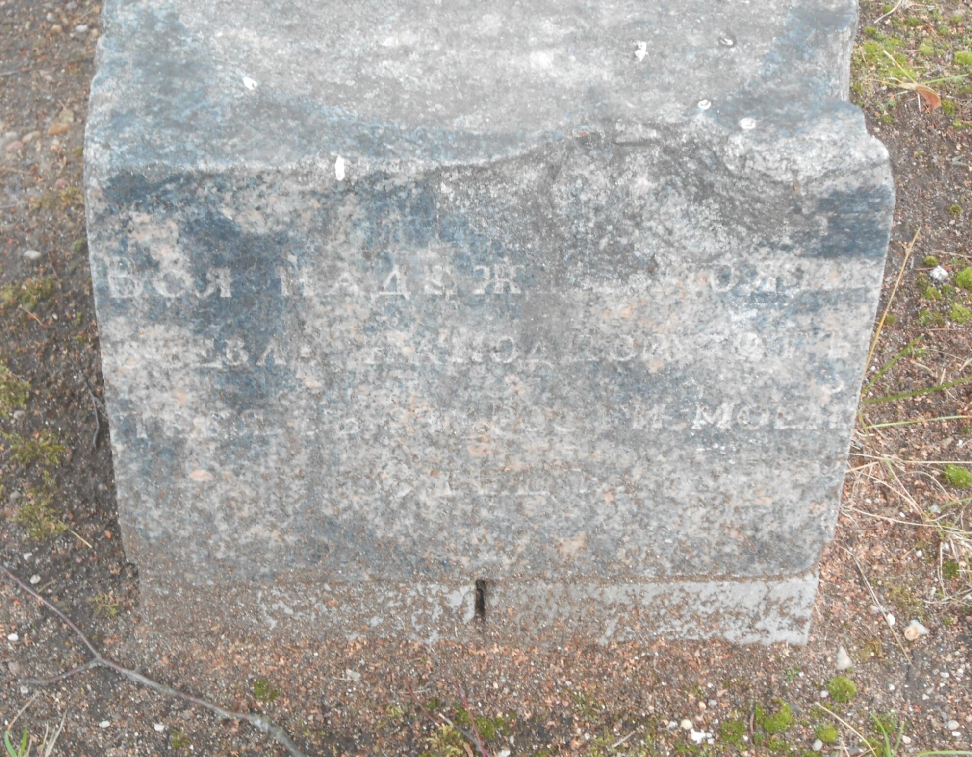 Несмотря на значительные повреждения, на поверхности камня чётко читается выбитая надпись кириллицей: «ВОЛ НАДЕЖ». Данная надпись, сохранившаяся вопреки разрушительному действию лет, является ключом к идентификации захоронения. Согласно историческим сведениям и географическим координатам, сей памятник находится на месте бывшего города Погорелое Городище в Смоленской области и представляет собой часть родового захоронения семьи Брагиных, относящегося к концу XIX столетия.