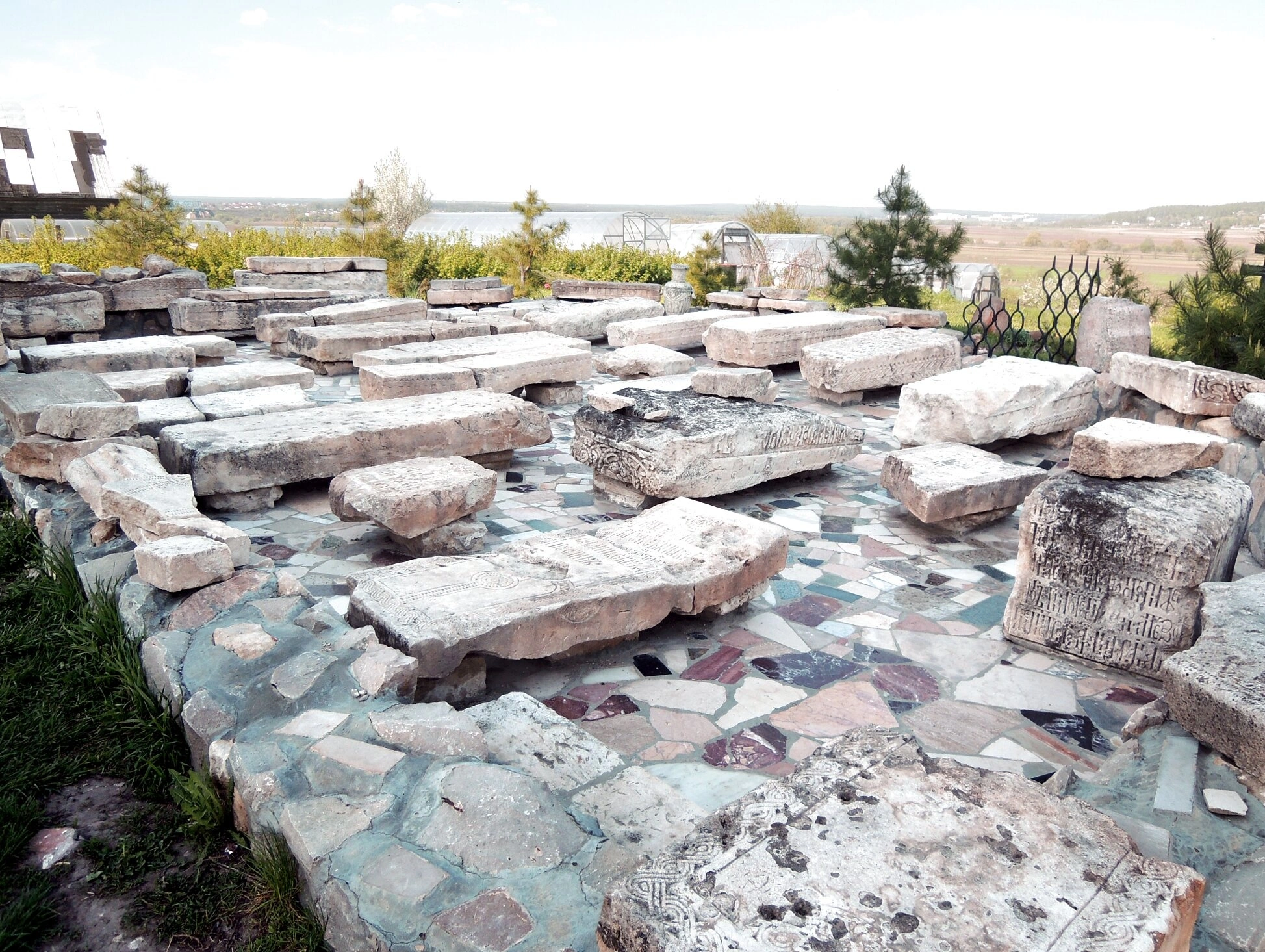 На представленной фотографии запечатлены старинные надгробные плиты, расположенные на территории, где ранее находилась Церковь Введения во храм Пресвятой Богородицы в селе Спас-на-Угре Калужской области. Эти каменные памятники являются свидетельством многовековой истории православного прихода и сохраняют память о поколениях верующих, погребённых на церковном погосте.