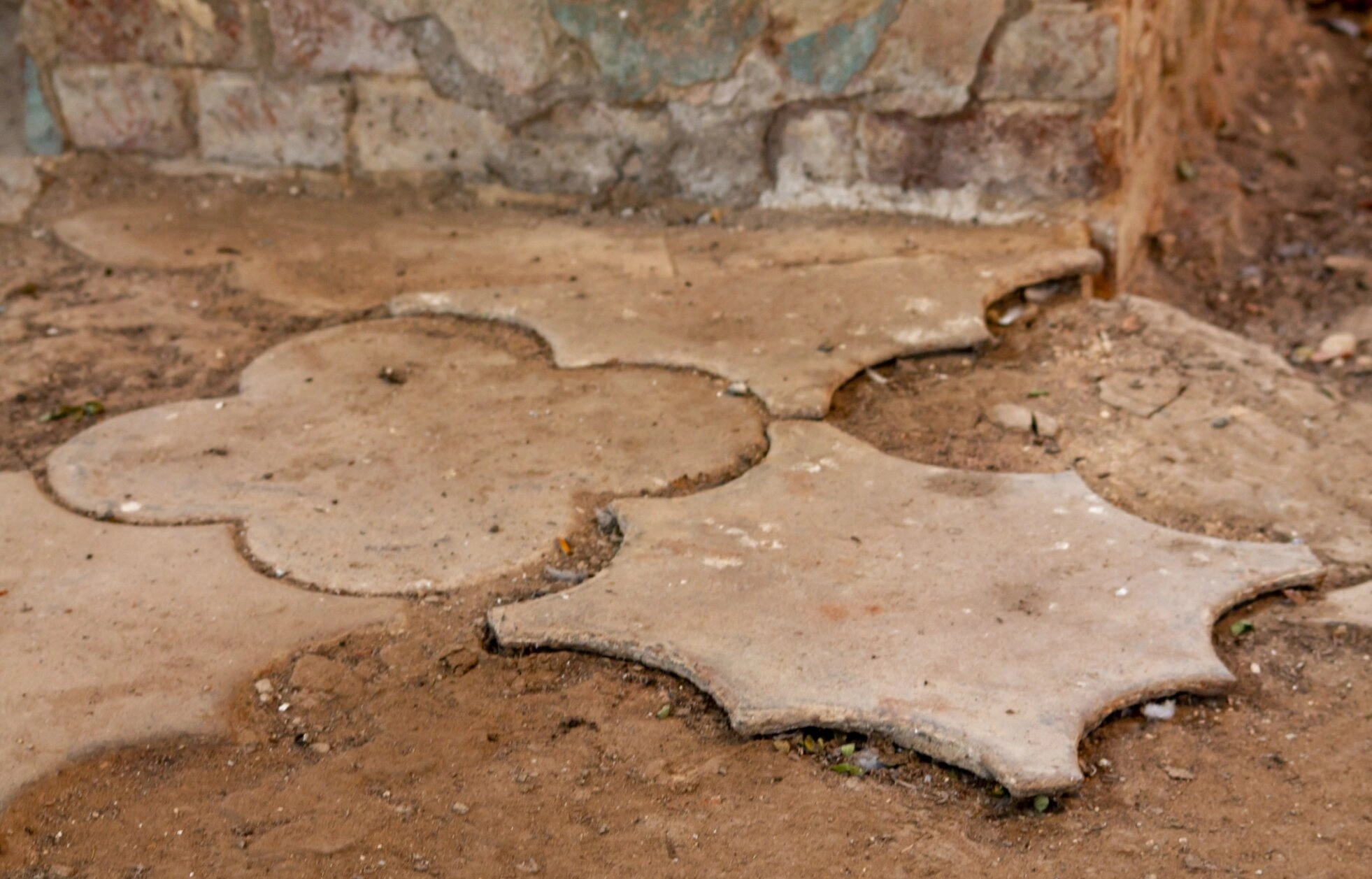 На представленной фотографии запечатлён уникальный исторический артефакт — фрагмент древнего плиточного покрытия, сохранившийся на территории храма Нерукотворного Образа Господня, что в селе Аксиньино. Изношенные временем декоративные плиты необычной формы, уложенные у подножия массивной каменной стены, являются немыми свидетелями многовековой истории этой святой обители.