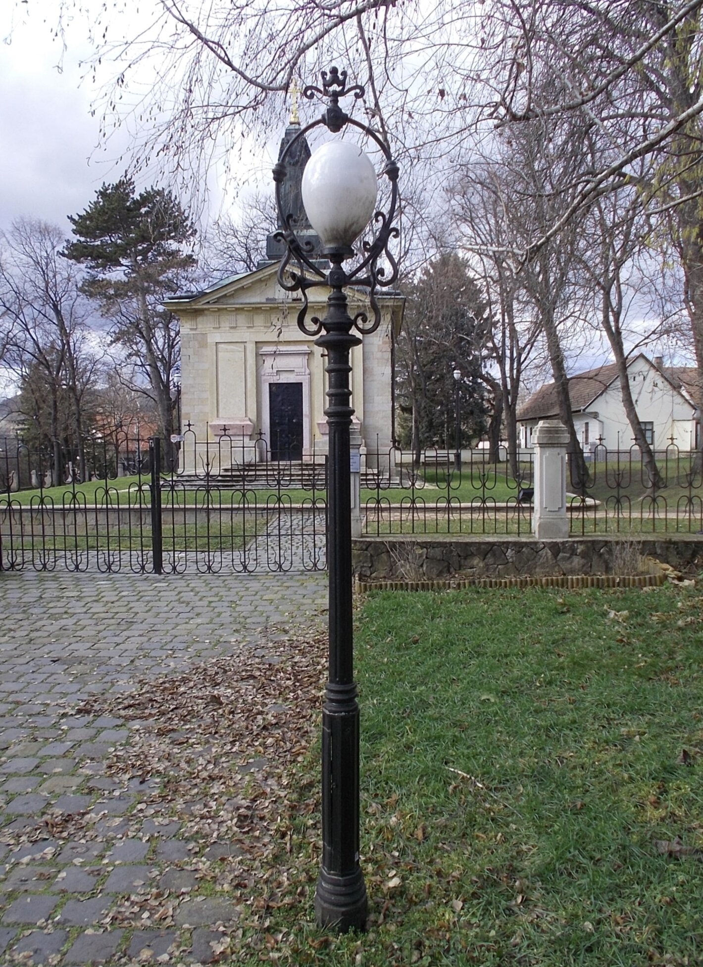 На представленной фотографии запечатлён старинный уличный фонарь, находящийся на территории православной часовни-усыпальницы Святой Благоверной Княгини Александры Павловны в посёлке Урём, что на окраине Будапешта. Этот светильник, выполненный в классическом стиле, не только является элементом освещения, но и важной деталью сакрального пространства, создающей молитвенную атмосферу в вечернее время.