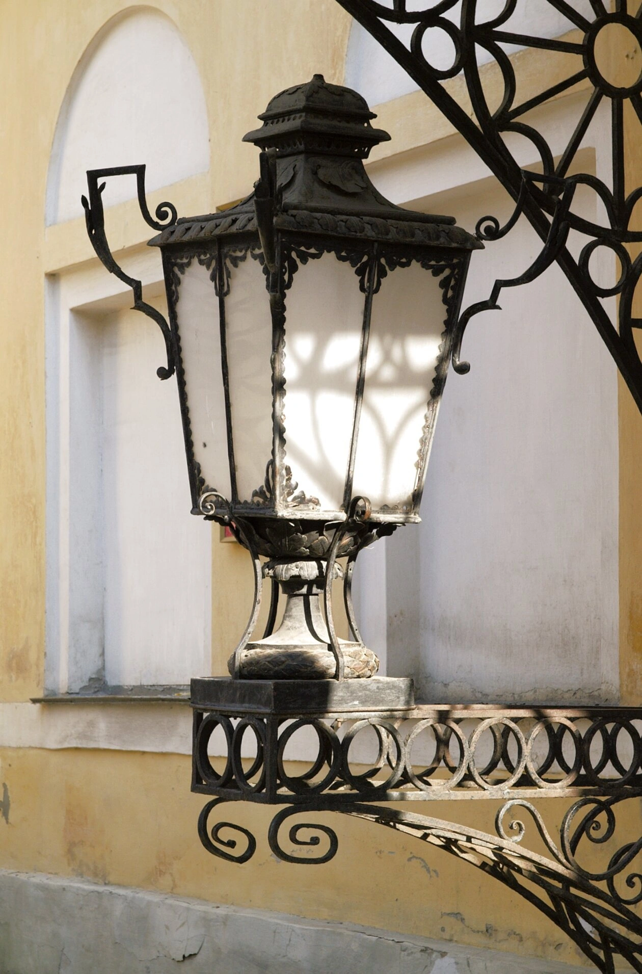 На представленной фотографии запечатлён старинный кованый фонарь, закреплённый на стене Церкви Рождества Христова в селе Рождествено Калужской области. Фонарь выполнен из тёмного металла с искусными элементами художественной ковки – декоративными завитками и узорами. Четыре стеклянные панели позволяют свету мягко рассеиваться, а отбрасываемые тени подчёркивают рельефность кованых деталей. Всё это создаёт образ традиционного храмового светильника, символизирующего свет веры и надежды.