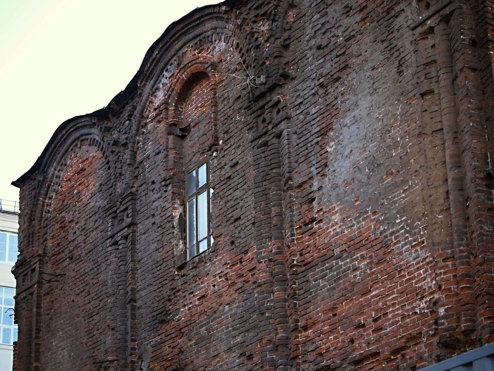 На представленной фотографии запечатлён фрагмент стены Церкви Рождества Пресвятой Богородицы, что расположена в исторической Бутырской слободе Москвы. Снимок демонстрирует уникальный образец храмовой архитектуры, где сохранилась подлинная кирпичная кладка конца XVII века. Стена выполнена из красного кирпича, характерного для московского зодчества того периода, с выраженными следами времени и атмосферных воздействий.