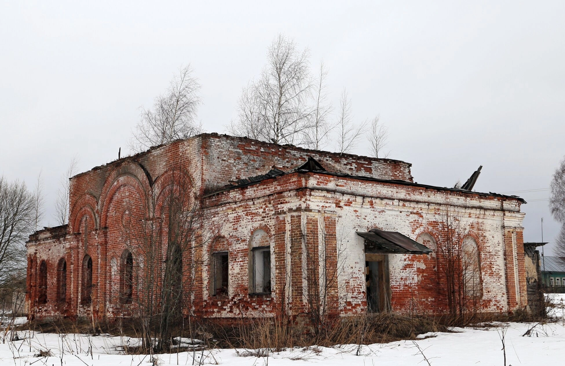 Архитектурные особенности павильона включают арочные оконные проемы и сводчатые перекрытия, характерные для церковных построек конца XIX - начала XX веков. Оконные и дверные проемы лишены остекления, некоторые из них заложены кирпичом. Вокруг сооружения лежит снежный покров, а произрастающие из стен и земли кустарники подчеркивают заброшенность места.