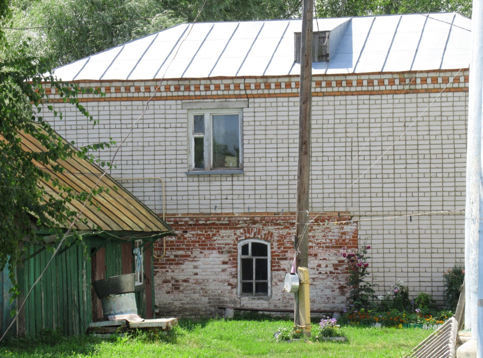 На представленной фотографии запечатлена одна из исторических построек, относящихся к комплексу Петропавловской церкви в селе Порецкое Чувашской Республики. На переднем плане изображена скромная, но ухоженная сторожка, выполнявшая в прошлом функцию жилища для церковного сторожа или причта. Небольшое здание с белым кирпичным фасадом и практичной металлической крышей воплощает в себе традиционный для подобных хозяйственных построек при храмах архитектурный аскетизм и функциональность.