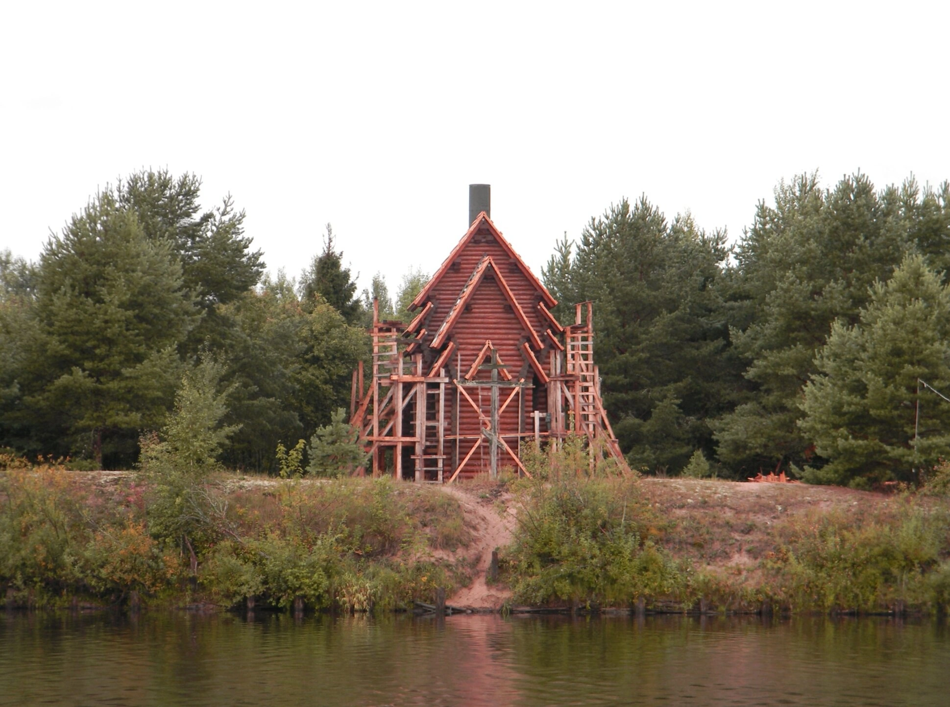 На переднем плане фотографии виден берег тихого лесного озера или затона реки, чья спокойная вода отражает небесную лазурь и окружающие хвойные деревья. Центральным объектом выступает сруб будущей часовни, собранный из добротных брёвен, с ещё незаконченной скатной крышей и возвышающимся над ней дымоходом. Вокруг здания видны строительные леса, что позволяет отнести момент съёмки к одному из начальных этапов благоустройства святого места.