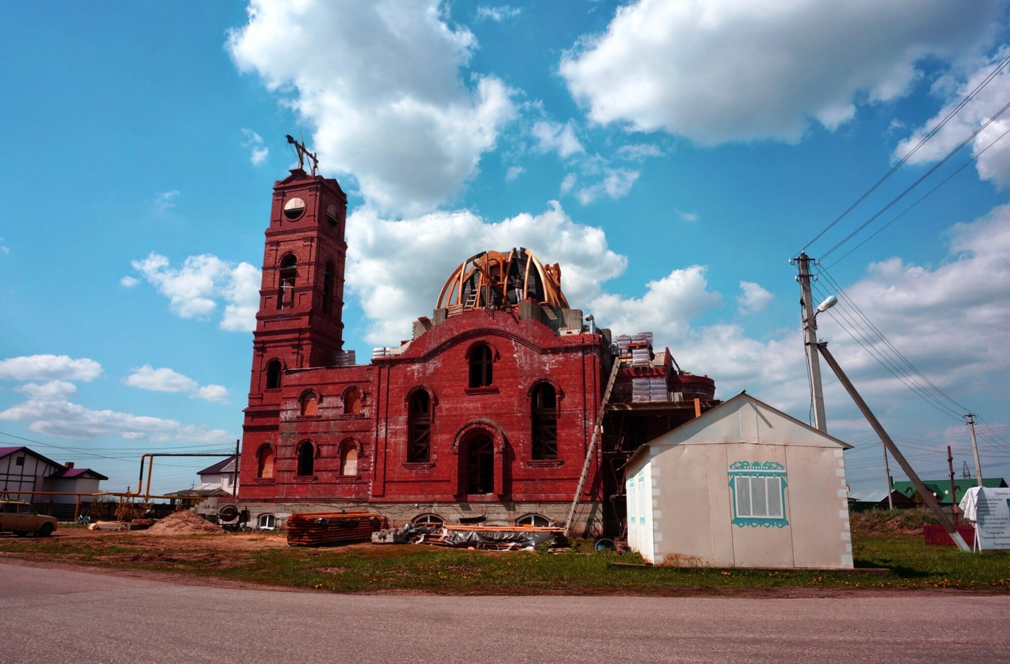 Колокольня увенчана шпилем и украшена часовым циферблатом, что является не только функциональным элементом, но и архитектурным украшением. Рядом с главным строением находится вспомогательное здание, вероятно, используемое для хозяйственных нужд или как временная часовня. На территории видны разложенные строительные материалы, готовые для использования в отделочных работах.