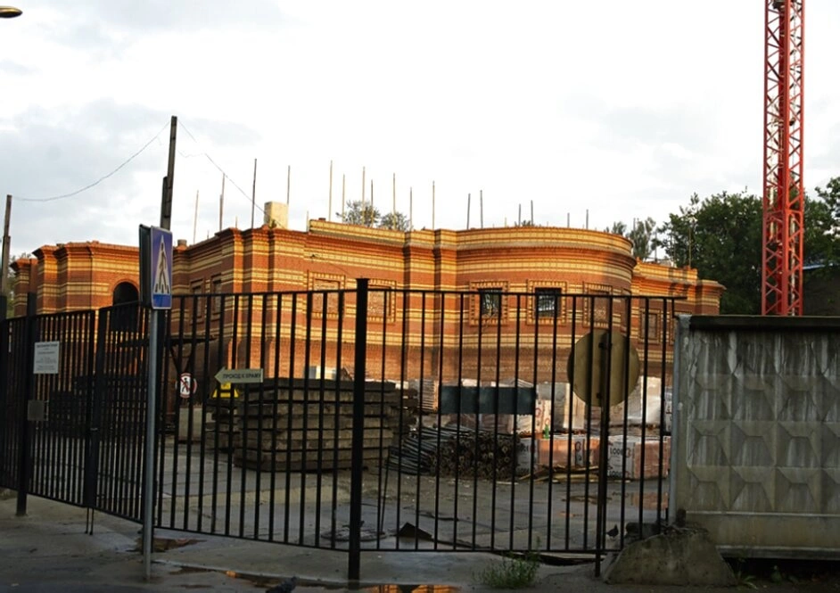 На представленной фотографии запечатлён ключевой этап строительства Храма Вознесения Господня в городе Электросталь Московской области. Возводимый из красного кирпича, храм обладает выразительным архитектурным обликом с закруглёнными элементами и апсидами, что характерно для традиционного церковного зодчества.