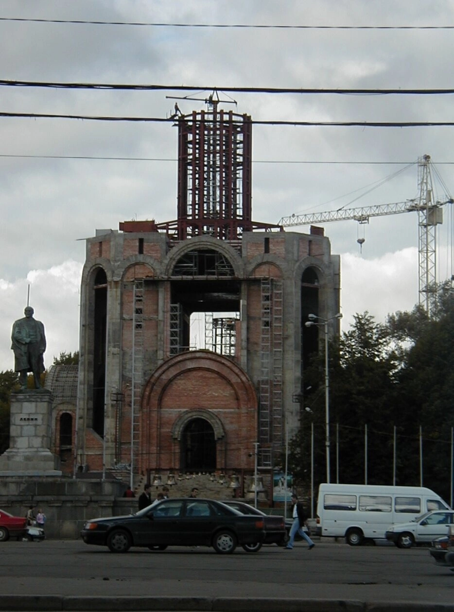 На переднем плане фотографии видна повседневная жизнь города: автомобили и пешеходы, спешащие по своим делам. Слева от собора установлена временная конструкция или постамент, привлекающий внимание. Главным же объектом кадра является сам храм, ещё окутанный лесами, но уже ясно угадывающийся в своих величественных формах. Белоснежные стены и золочёные купола, которые в будущем засияют над городом, находятся в процессе своего становления.
