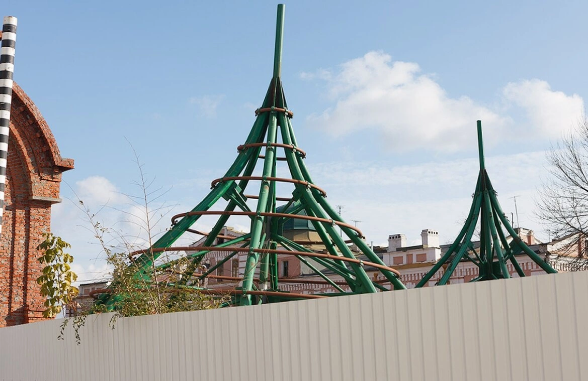 На представленной фотографии запечатлён важный этап возрождения духовной жизни Тамбова – строительство купола соборного храма в честь Вознесения Господня, являющегося частью ансамбля Вознесенского женского монастыря. На переднем плане видны металлические конструкции зелёного цвета, представляющие собой каркас будущего купола и барабана, увенчанные традиционной православной главкой. Эти элементы символизируют непрерывный процесс созидания и восстановления святых обителей.