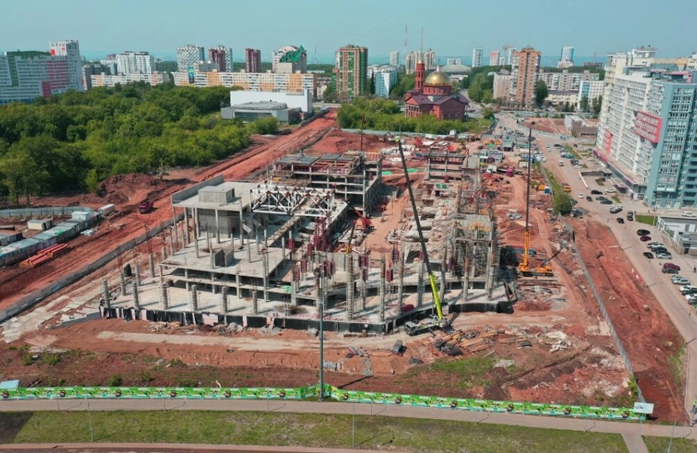 На представленной фотографии запечатлён ключевой момент современного градостроительства в столице Башкортостана — масштабная строительная площадка в самом сердце Уфы. На переднем плане активно ведётся возведение современного многофункционального комплекса, предположительно известного как «Центр борьбы». Видны монолитные железобетонные конструкции, элементы каркаса зданий, башенные краны и иная строительная техника, что свидетельствует о полном разгаре работ.