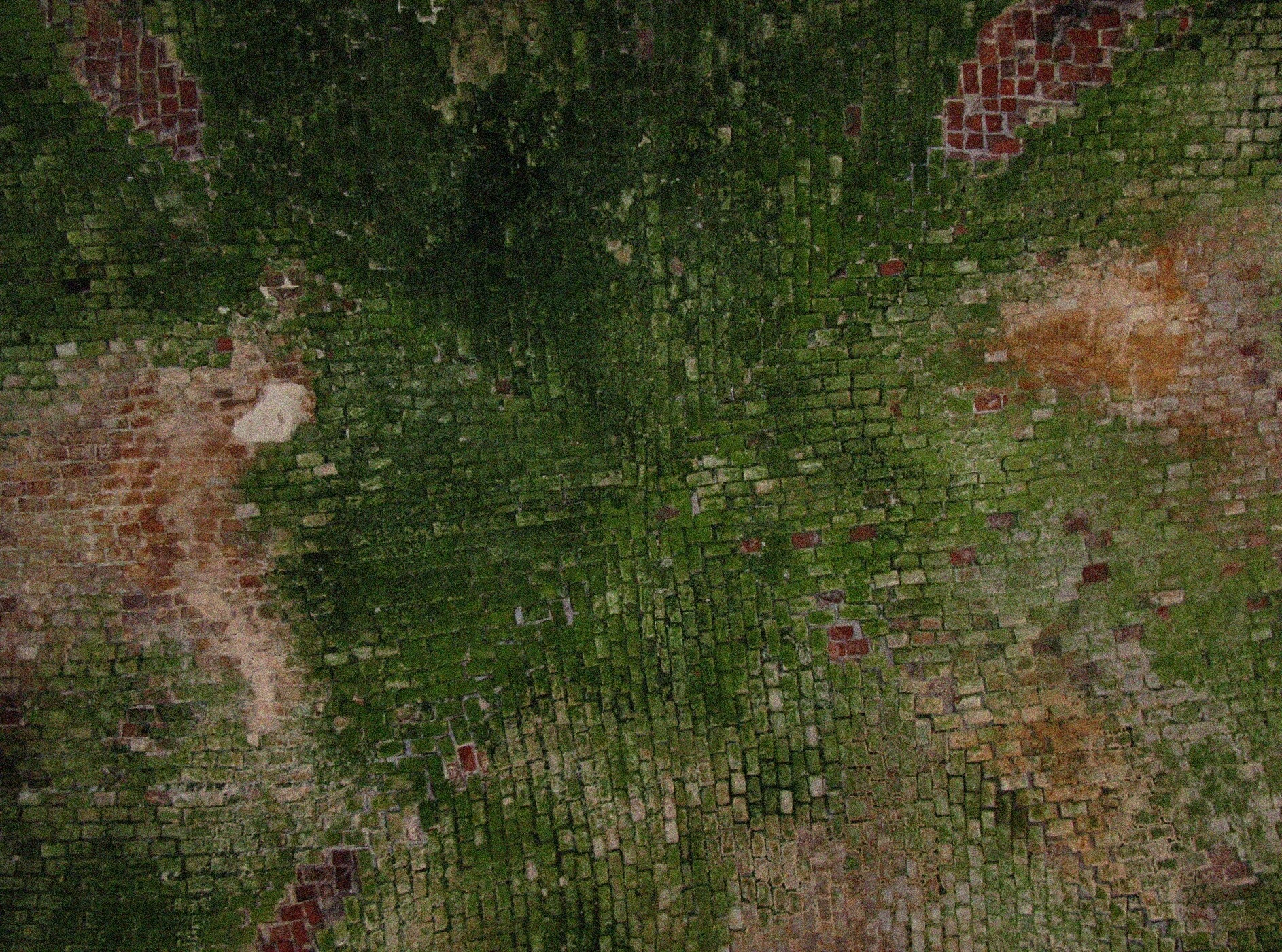 Изображение демонстрирует благородную фактуру старинной кирпичной кладки, частично покрытую слоем зелёного мха. Этот естественный покров, возникший от времени и особого микроклимата храма, придаёт поверхности свода особую текстуру и глубину, символизируя многовековую историю православной веры на этой земле. На отдельных участках сквозь растительность проступает аутентичный материал, позволяя оценить мастерство зодчих прошлого.