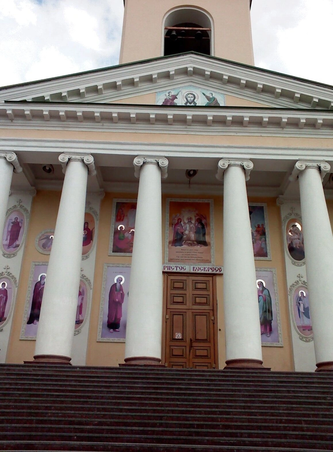Главный вход обрамлён четырьмя мощными колоннами дорического ордера, которые поддерживают треугольный фронтон, создавая ощущение монументальности и незыблемости веры. Массивные деревянные двери гостеприимно открыты для всех прихожан и паломников. Пространство между колоннами и над входом богато украшено священными изображениями: фресками и иконами, на которых, при внимательном рассмотрении, можно различить лики святых и библейские сюжеты, настраивающие на молитвенный лад ещё до входа в храм.