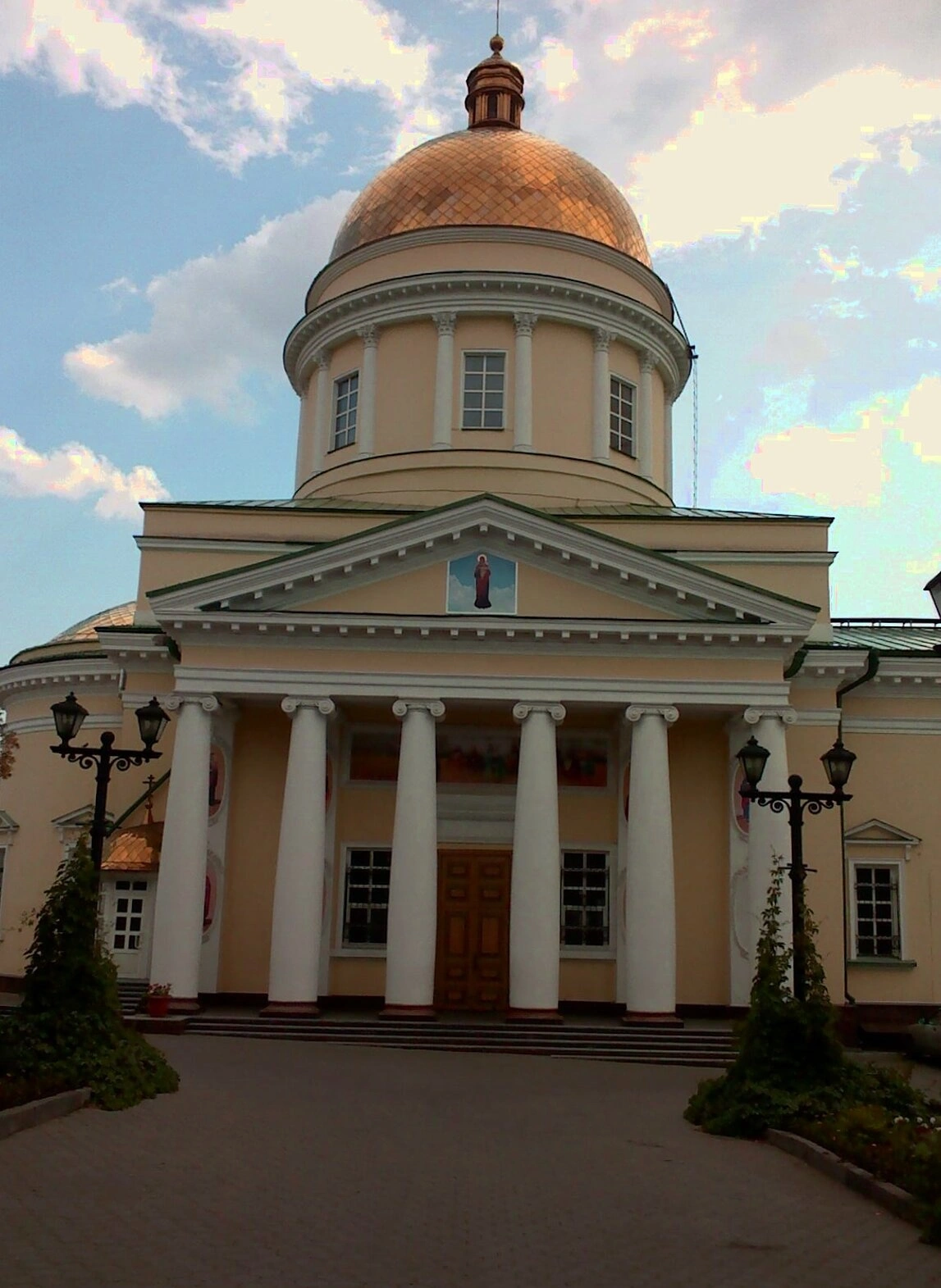 Архитектура храма представляет собой выдающийся образец русского классицизма. Центральный объём венчает массивный золочёный купол на высоком световом барабане, который главенствует в силуэте сооружения. Главный фасад украшает монументальный портик с шестью колоннами коринфского ордера, что придаёт собору торжественный и строгий вид. Белоснежные стены храма эффектно контрастируют с сиянием золотых куполов и крестов, создавая образ неземной красоты и духовного величия.