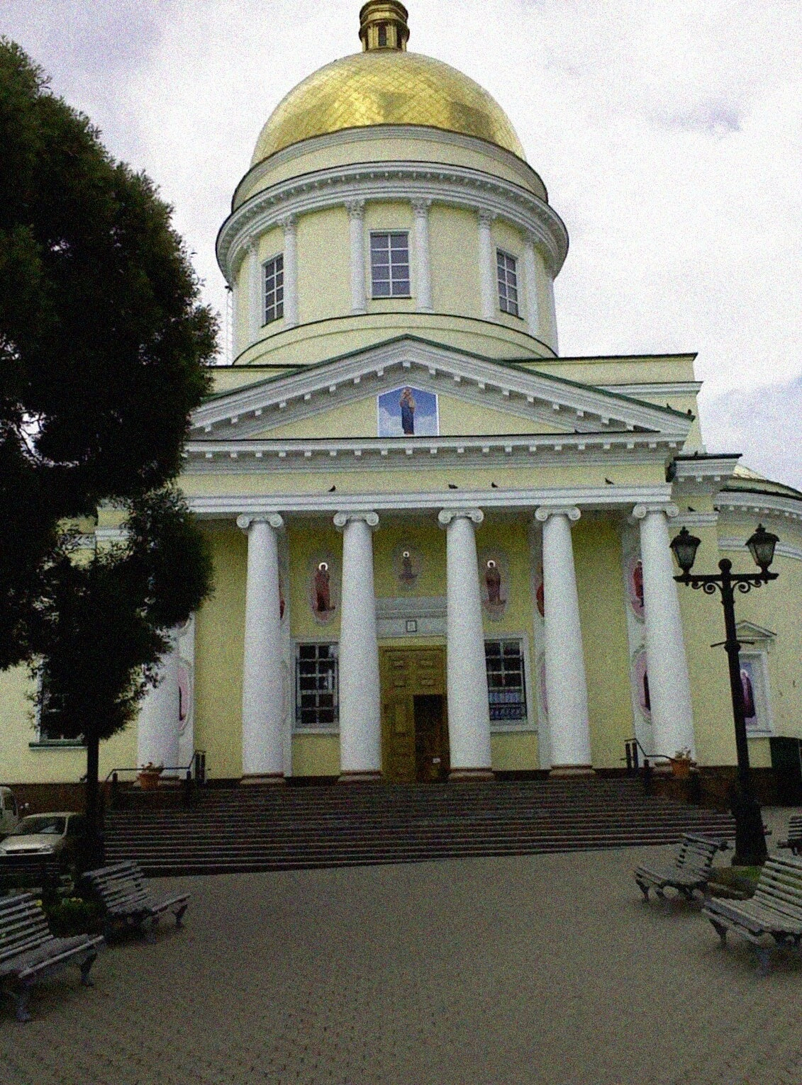 На фасаде здания внимательный взгляд различит священные изображения — иконы, размещённые в нишах и над входной группой, которые осеняют всех входящих под свой молитвенный покров. Собор окружён благоустроенной территорией с мощёными дорожками, что подчёркивает его значимость как центра духовного притяжения. Пасмурное небо на заднем плане лишь оттеняет светлый образ храма, напоминая о вечном и непреходящем значении православной веры в сердцах людей. Возведённый в 1823 году по проекту знаменитого зодчего Андреяна Захарова, собор прошёл сложный исторический путь, был возвращён Церкви и вновь освящён в 1994 году, продолжив свою благодатную миссию.