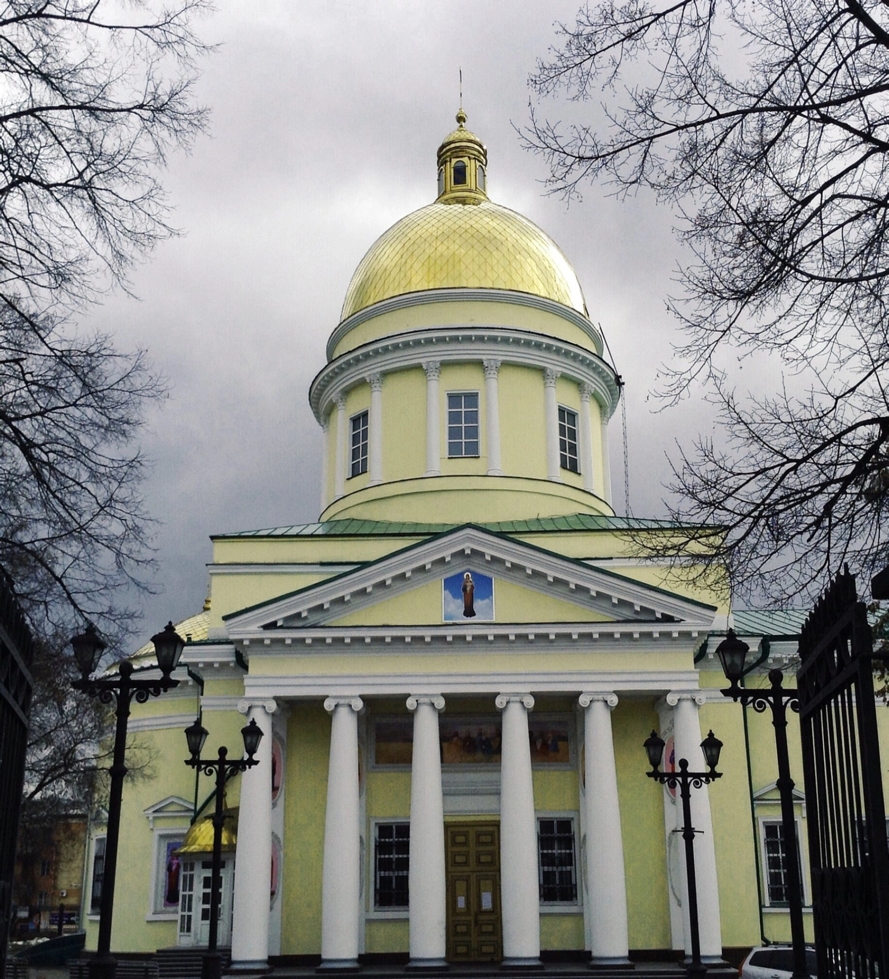 Архитектурный облик собора, выполненный в стиле классицизма, поражает своим благолепием и строгостью форм. Центральный объём храма увенчан массивным золочёным куполом, который горделиво парит над городом, сияя в лучах солнца и напоминая о горнем мире. Главный фасад украшен монументальным портиком с четырьмя белоснежными колоннами, что придаёт зданию торжественный и величественный вид. Над входом, в треугольном фронтоне, располагается священное изображение, призывающее благословение Божие на всех входящих под кров храма.
