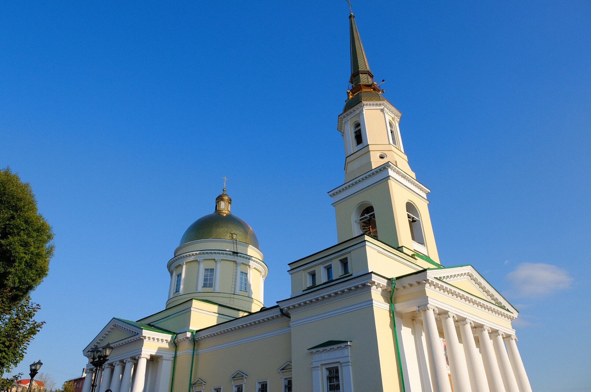 На представленной фотографии запечатлён величественный Свято-Александро-Невский кафедральный собор, находящийся в столице Удмуртской Республики — городе Ижевске. Этот выдающийся православный храм, освящённый в честь святого благоверного князя Александра Невского, является не только духовным центром региона, но и ценным памятником истории и архитектуры федерального значения.