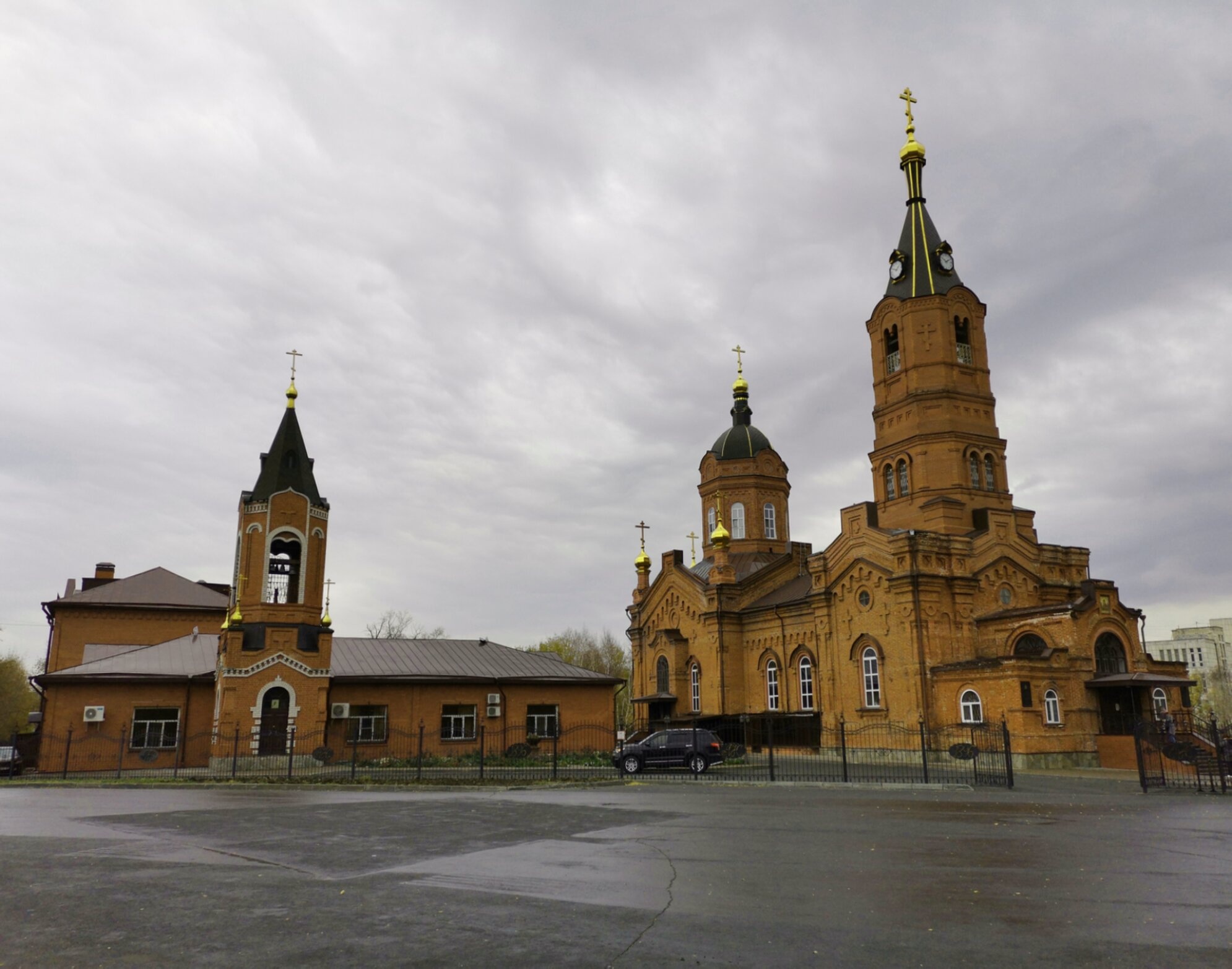 На представленной фотографии запечатлён величественный Свято-Александро-Невский кафедральный собор, расположенный в городе Кургане. Этот православный храм, освящённый в честь святого благоверного князя Александра Невского, является одним из духовных центров Зауралья и выдающимся памятником церковной архитектуры конца XIX века.