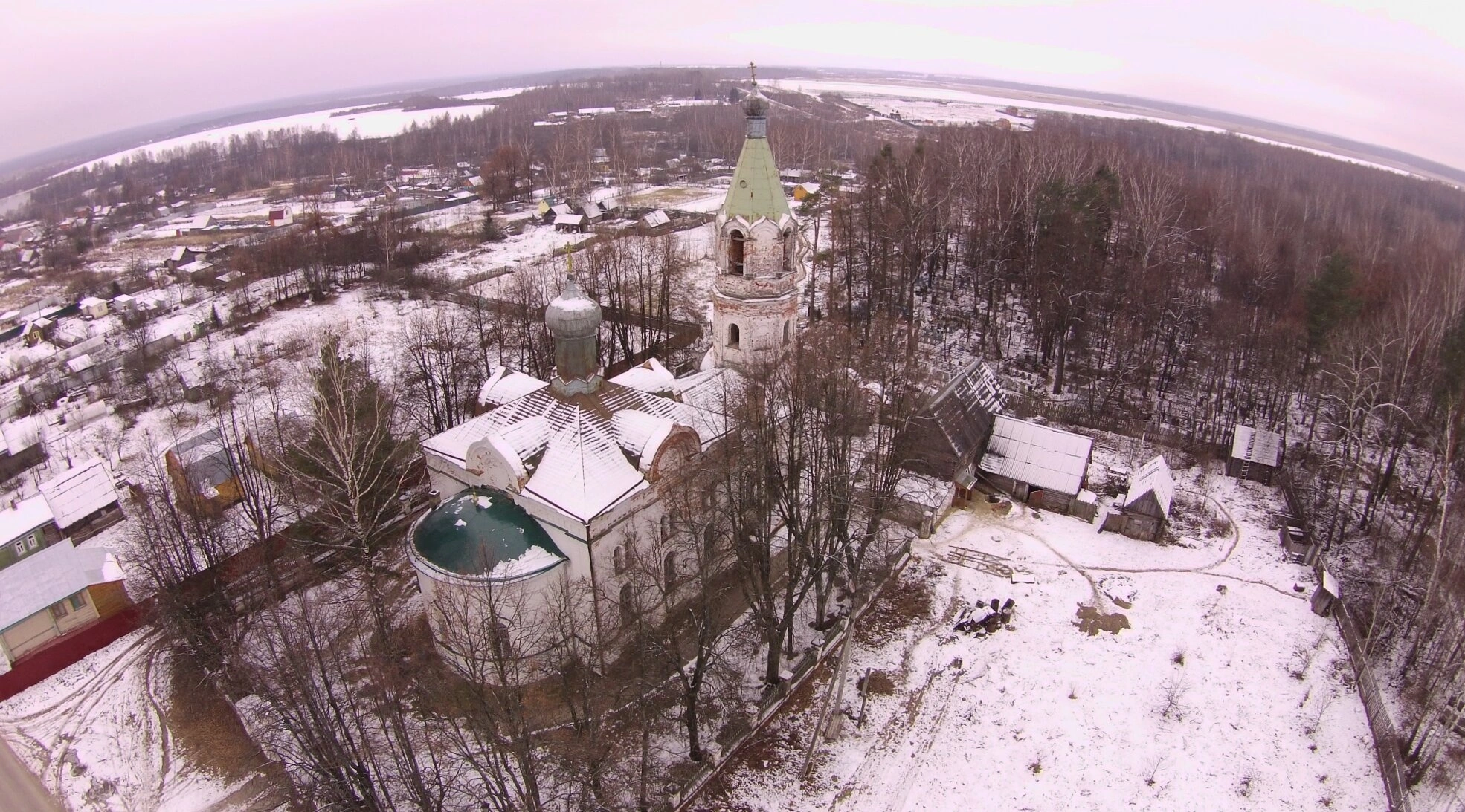 На представленной фотографии запечатлен Свято-Боголюбский храм, расположенный в селе Заречное Собинского района Владимирской области. Снимок выполнен в зимний период с высоты птичьего полета, что позволяет оценить величественность церковной архитектуры и гармонию храма с окружающим природным ландшафтом.
