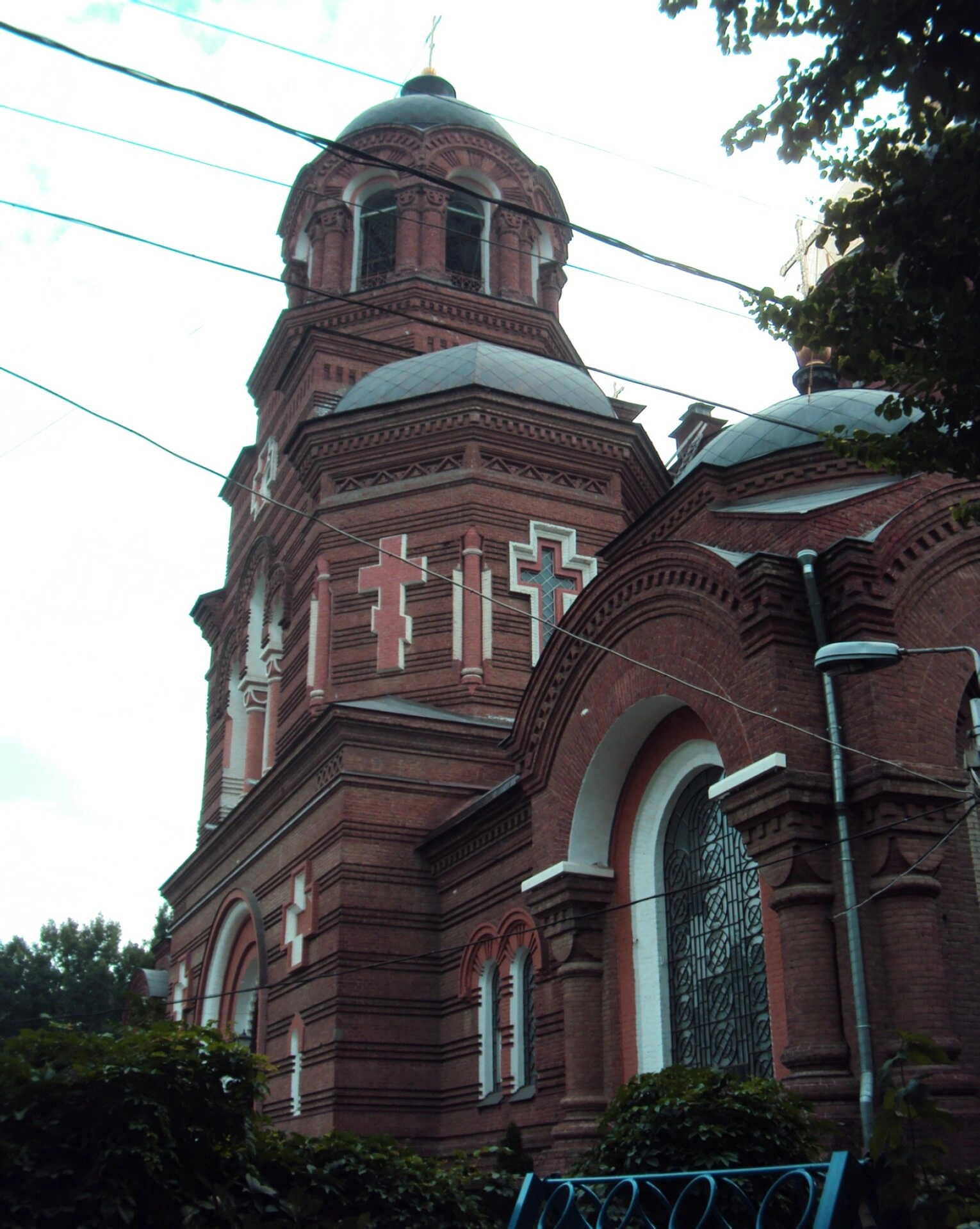 На фотографии хорошо просматривается композиция храма, увенчанная пятью золочеными главами, символизирующими Христа и четырех евангелистов. Центральный купол, доминирующий над остальными, окружен четырьмя меньшими главами, создавая гармоничный архитектурный ансамбль. Фасад собора выполнен из красного кирпича с искусно выполненными декоративными элементами — арками, колоннами и орнаментальными поясами, характерными для византийского церковного зодчества.