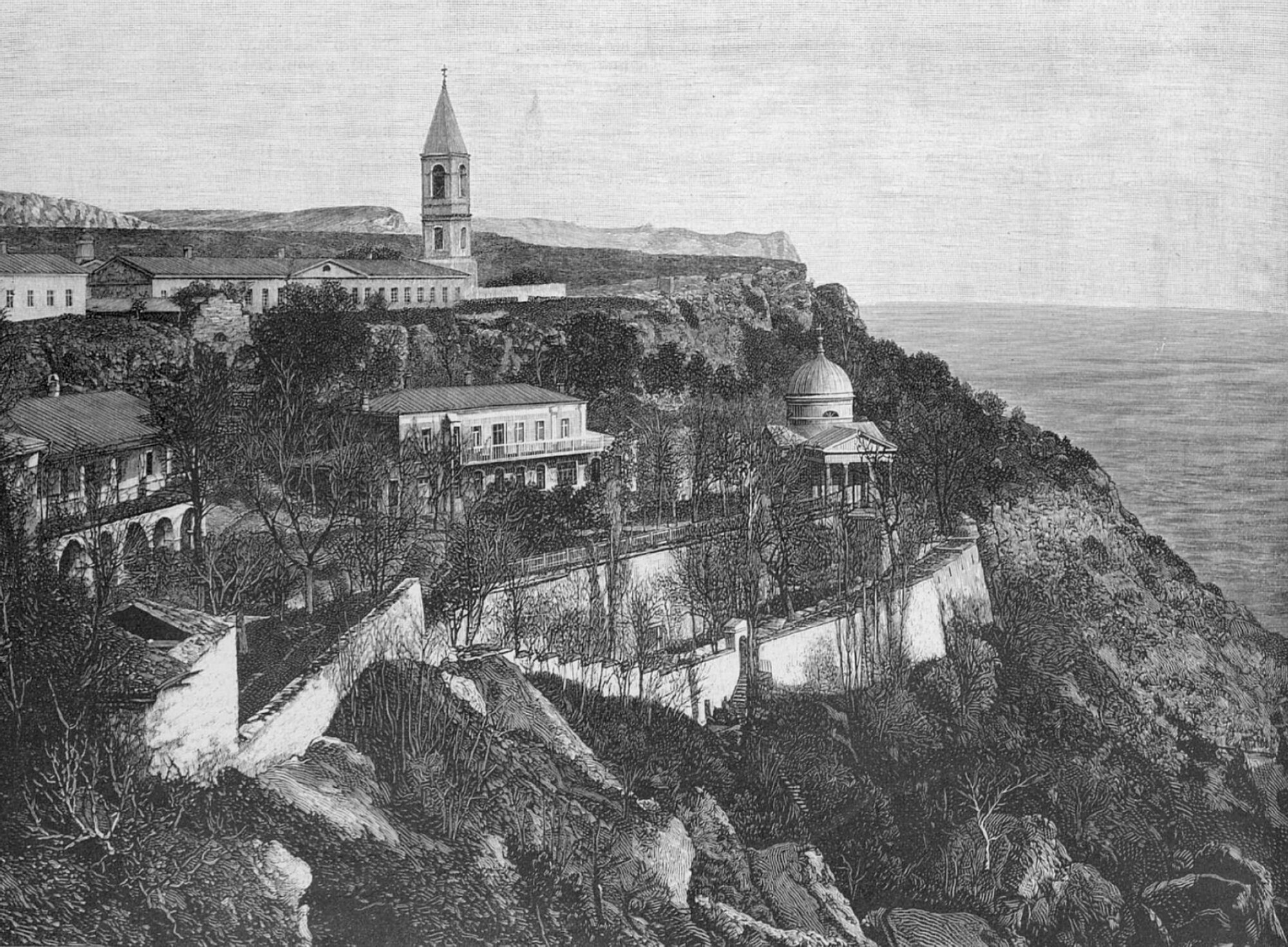 Обитель пережила периоды расцвета и запустения, но благодаря вере и трудам братии всегда возрождалась. Вид монастыря на заре его существования, зафиксированный на данном снимке, позволяет оценить его величие и строгую красоту, открывающуюся с моря. Место, где находится монастырь, освящено молитвой и подвигом многих поколений иноков, что делает его одной из самых почитаемых святынь Крымской земли.