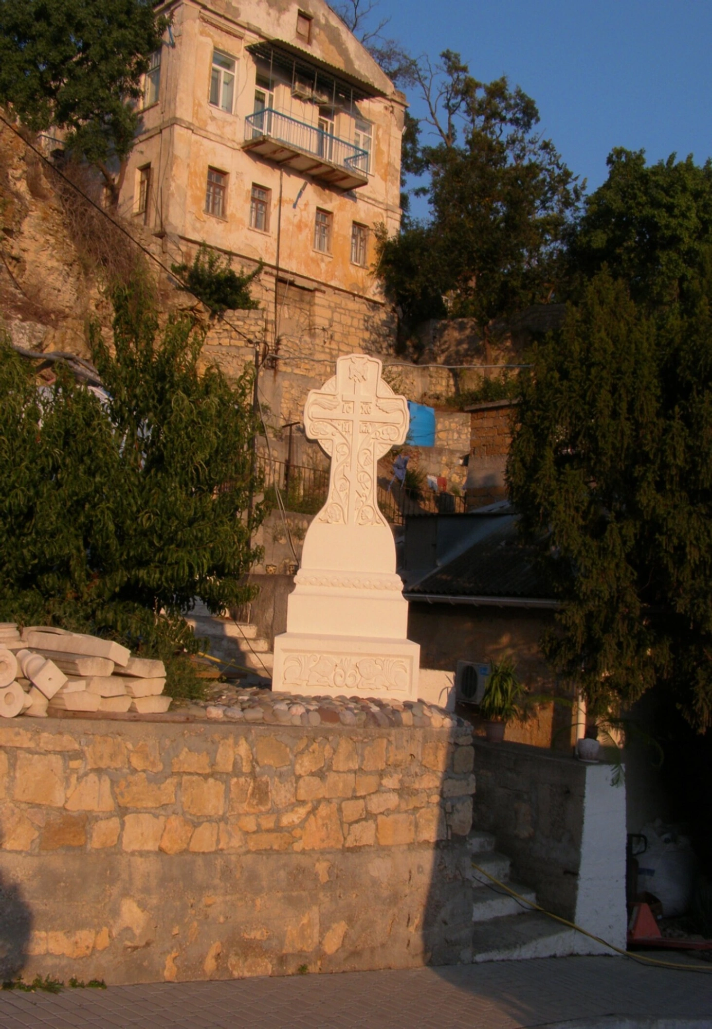 На представленной фотографии запечатлён один из видов древнейшей православной обители Крыма — Свято-Георгиевского Балаклавского мужского монастыря, расположенного на живописном мысе Фиолент близ Севастополя. На переднем плане возвышается ослепительно белый каменный поклонный крест, установленный на массивном каменном постаменте. Этот крест является не только духовным символом, но и напоминанием о многовековой истории монастыря, основанного, по преданию, в 891 году святогорскими монахами.