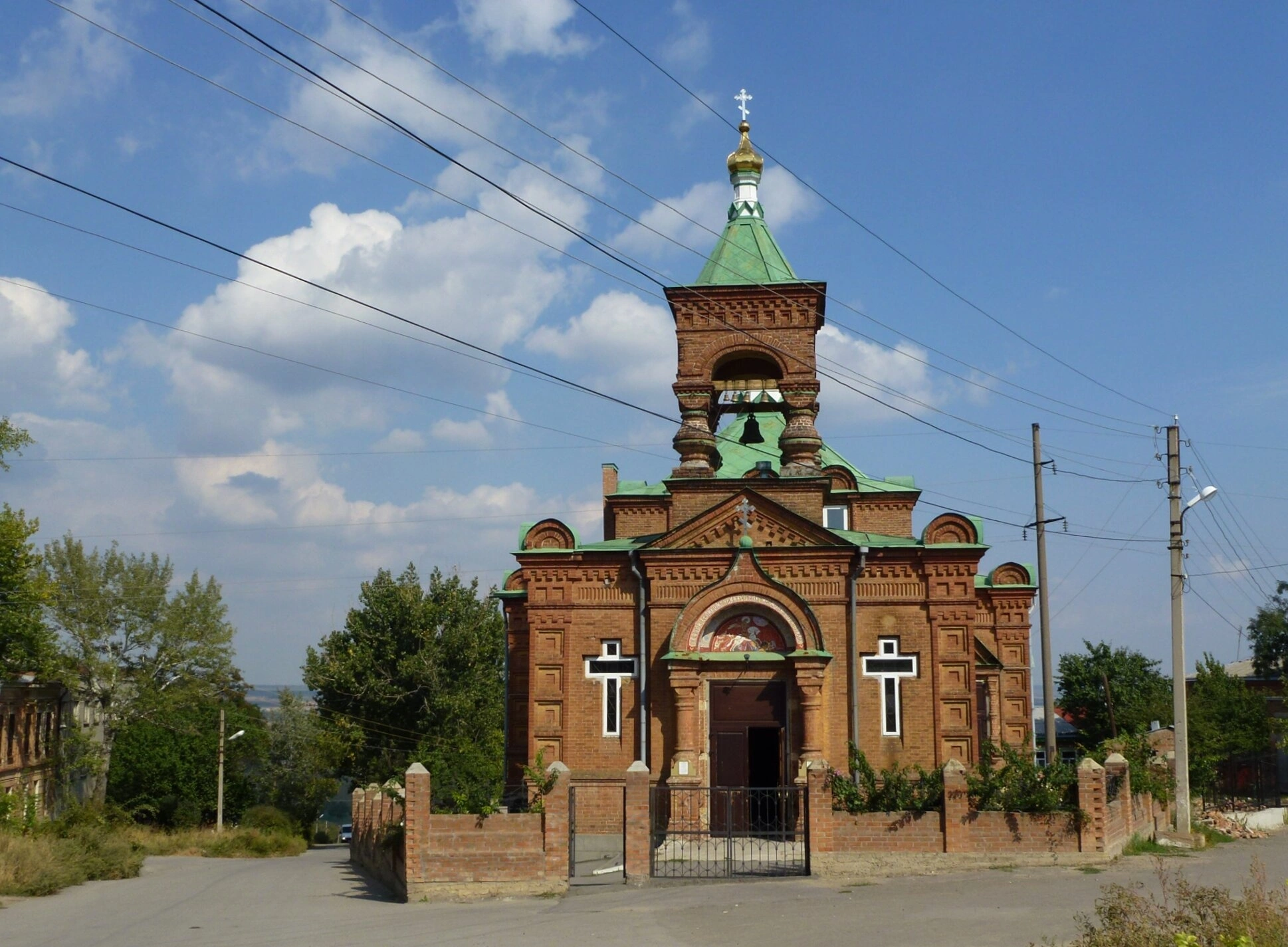 Фотография сделана в ясный солнечный день, что подчёркивает красоту краснокирпичных стен и яркость зелёных куполов на фоне голубого неба с легкими облаками. Естественное освещение выгодно выделяет архитектурные детали и создаёт светлую, радостную атмосферу, соответствующую духовному назначению этого места.