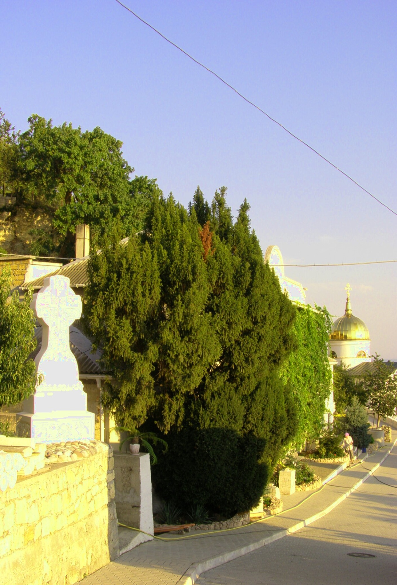 Справа от дороги возвышается каменная ограда, сложенная из светлого инкерманского камня, на которой установлен белый православный крест — символ веры и спасения. Вдоль всего пути растут стройные кипарисы, являющиеся неотъемлемой частью крымского ландшафта и создающие благоговейную атмосферу уединения и молитвенного настроения.