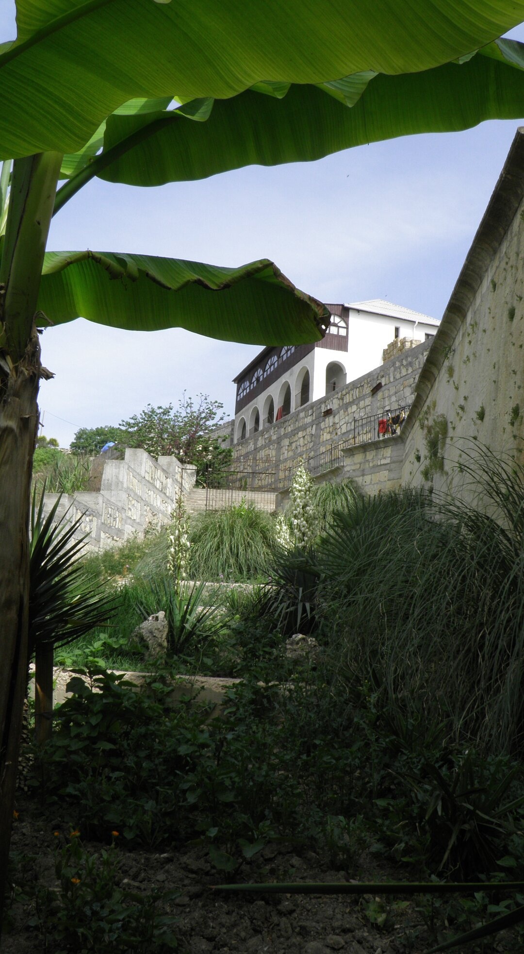 На переднем плане снимка обильную крымскую растительность олицетворяет крупный лист бананового растения (азимины), что подчёркивает уникальный мягкий климат этих мест. Центральную часть композиции занимают характерные для южного побережья Крыма высокие травы и цветущие растения, сквозь которые проступают белоснежные стены монастырских построек. На склоне холма хорошо различима подпорная стена из светлого инкерманского камня, выполняющая функцию укрепления террасы.