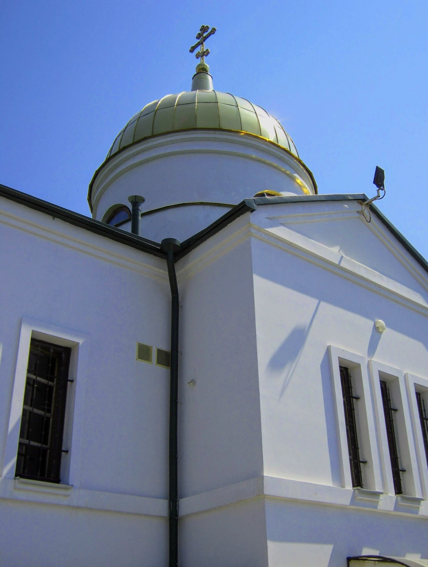 На вершине купола установлен православный крест, который является не только архитектурным элементом, но и символом спасения и искупления человечества. Крест напоминает о жертве Христа и дарует надежду всем верующим. Фасад здания выполнен в светлых тонах, что характерно для классической храмовой архитектуры Крыма. Чёткие линии и строгие формы подчёркивают величие и духовную строгость обители.
