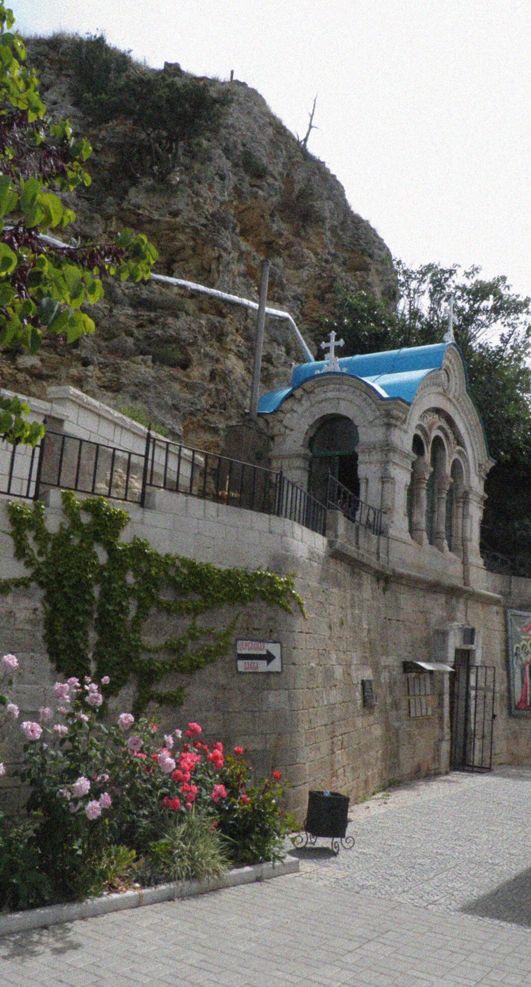 Слева от святых врат видна каменная монастырская стена, увитая виноградной лозой, что символизирует истинную лозу — Христа. Возвышающийся на заднем плане скалистый обрыв мыса Фиолент является не только природной достопримечательностью, но и немым свидетелем многовековой истории этой святыни. По преданию, первый пещерный храм был основан здесь ещё в далёком 891 году греческими мореплавателями, спасёнными от бури святым великомучеником Георгием Победоносцем.