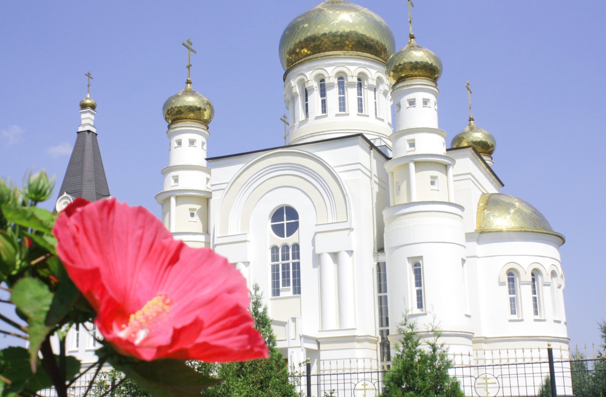 На переднем плане снимка, создавая яркий и трогательный контраст с каменной мощью собора, изображён нежный розовый цветок, вероятно, гибискус. Этот живой элемент олицетворяет красоту Божьего мира и привносит в композицию особую лиричность и теплоту, напоминая о бренности земной жизни перед вечной духовной красотой дома Господня.