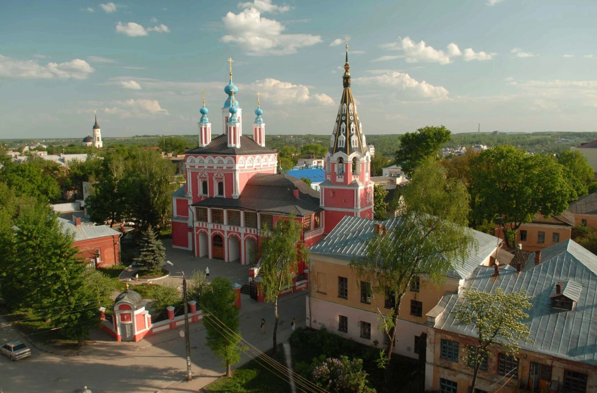 На фотографии запечатлён величественный Свято-Георгиевский собор, известный в народе как храм «за верхом». Этот уникальный православный собор, расположенный в историческом центре Калуги, является выдающимся памятником церковной архитектуры начала XVIII века и объектом культурного наследия.
