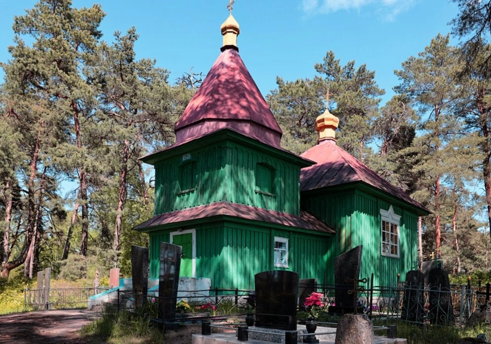 На представленной фотографии запечатлена Свято-Ильинская церковь, расположенная на территории кладбища в деревне Саковщина Воложинского района Минской области. Этот деревянный храм, освящённый во имя святого пророка Божия Илии, является образцом традиционного церковного зодчества и духовным центром для местных жителей.