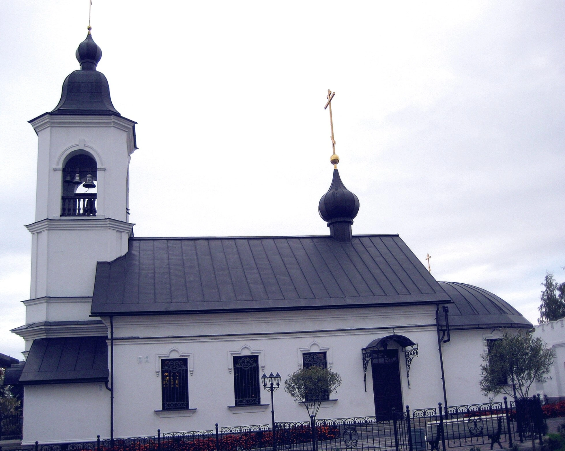 На представленной фотографии запечатлён величественный облик Свято-Ильинского храма, православной святыни города Выборга. Белоснежные стены церкви, увенчанные тёмными куполами, создают образ чистоты и духовного величия. На переднем плане видны ухоженные клумбы с цветами, подчёркивающие благолепие и заботу, окружающие этот дом Божий.