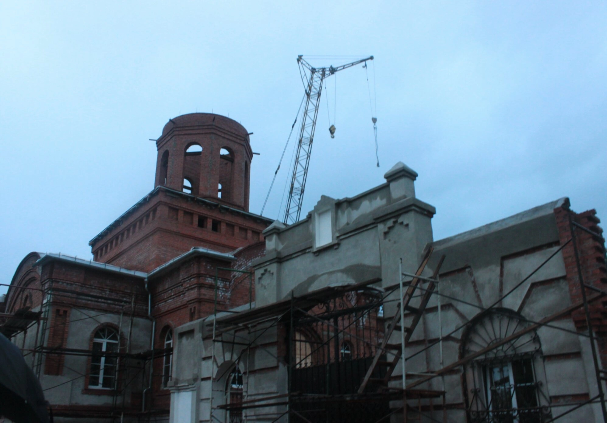 Архитектурный облик монастыря представляет большой интерес для ценителей церковного зодчества. На снимке можно наблюдать характерную кирпичную кладку, элементы классицизма в оформлении фасадов и традиционную для православных монастырей планировку. Особое внимание привлекает купольная часть одного из храмов, увенчанная православным крестом, который символизирует надежду на возрождение древней обители после decades запустения в советский период.
