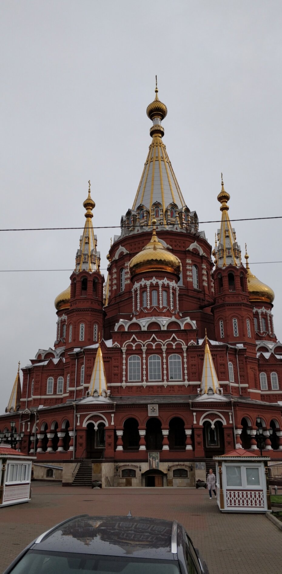 На представленной фотографии запечатлён величественный Свято-Михайловский кафедральный собор, возвышающийся на самой высокой точке города Ижевска. Белоснежные стены и сияющие золотом купола храма, увенчанные православными крестами, создают образ неземной красоты и духовной торжественности, видимый из многих районов столицы Удмуртии.