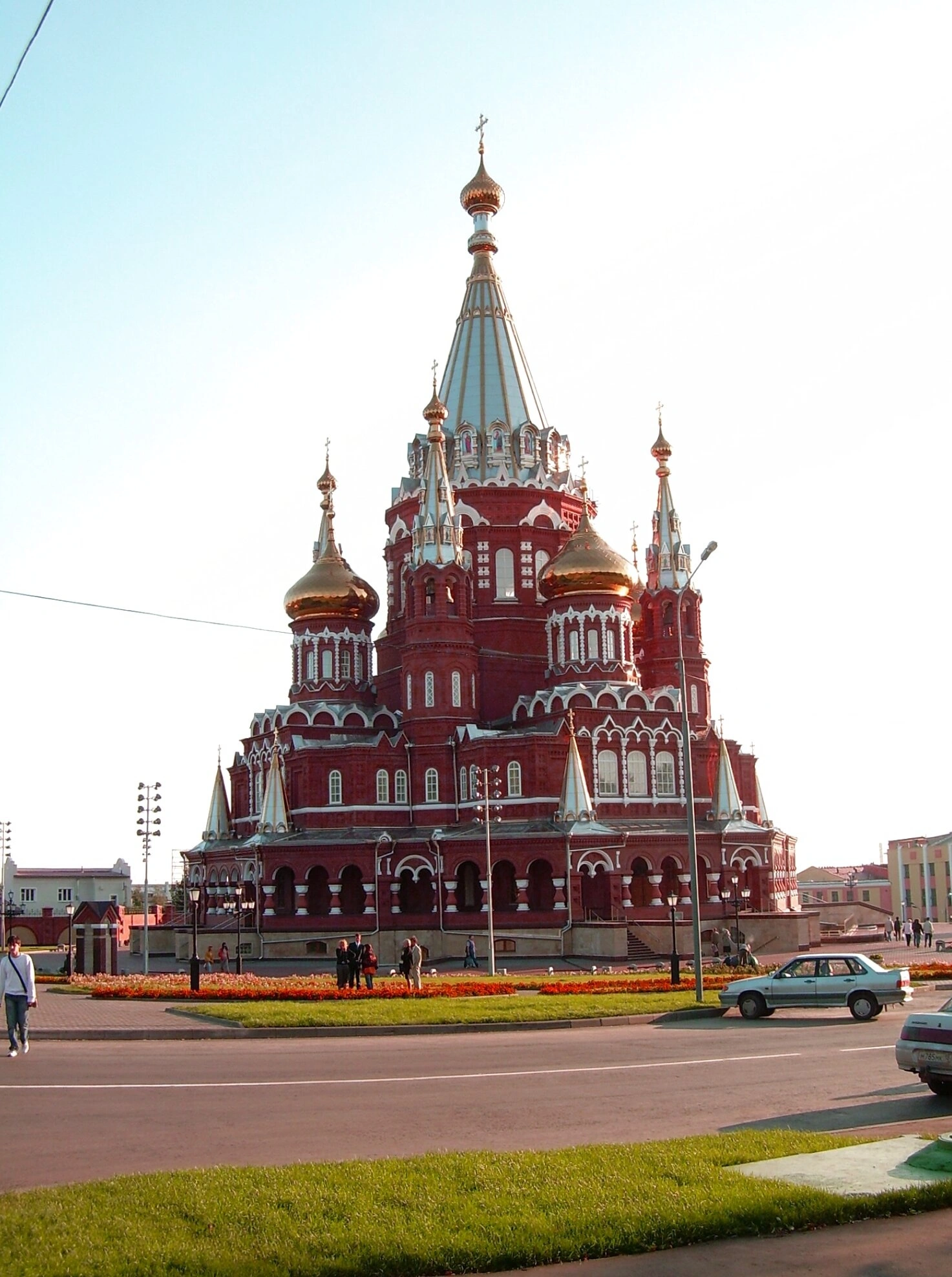 На представленной фотографии запечатлён величественный Свято-Михайловский кафедральный собор, возвышающийся на одном из самых высоких мест в столице Удмуртской Республики — городе Ижевске. Этот монументальный храм, освящённый в честь Архистратига Божия Михаила, является не только духовным сердцем города, но и его ключевой архитектурной доминантой, видимой издалека.
