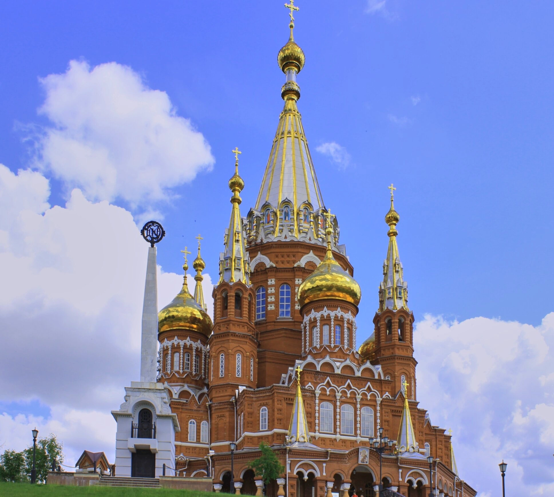 На фотографии запечатлён величественный Свято-Михайловский кафедральный собор, расположенный в городе Ижевске. Этот православный храм, освящённый в честь святого Архистратига Михаила, является кафедральным собором Ижевской епархии и одной из главных духовных достопримечательностей Удмуртии. Собор возвышается на шестьдесят семь метров и находится на одной из самых высоких точек города, на Красной площади, благодаря чему его сияющие купола видны из многих районов города.