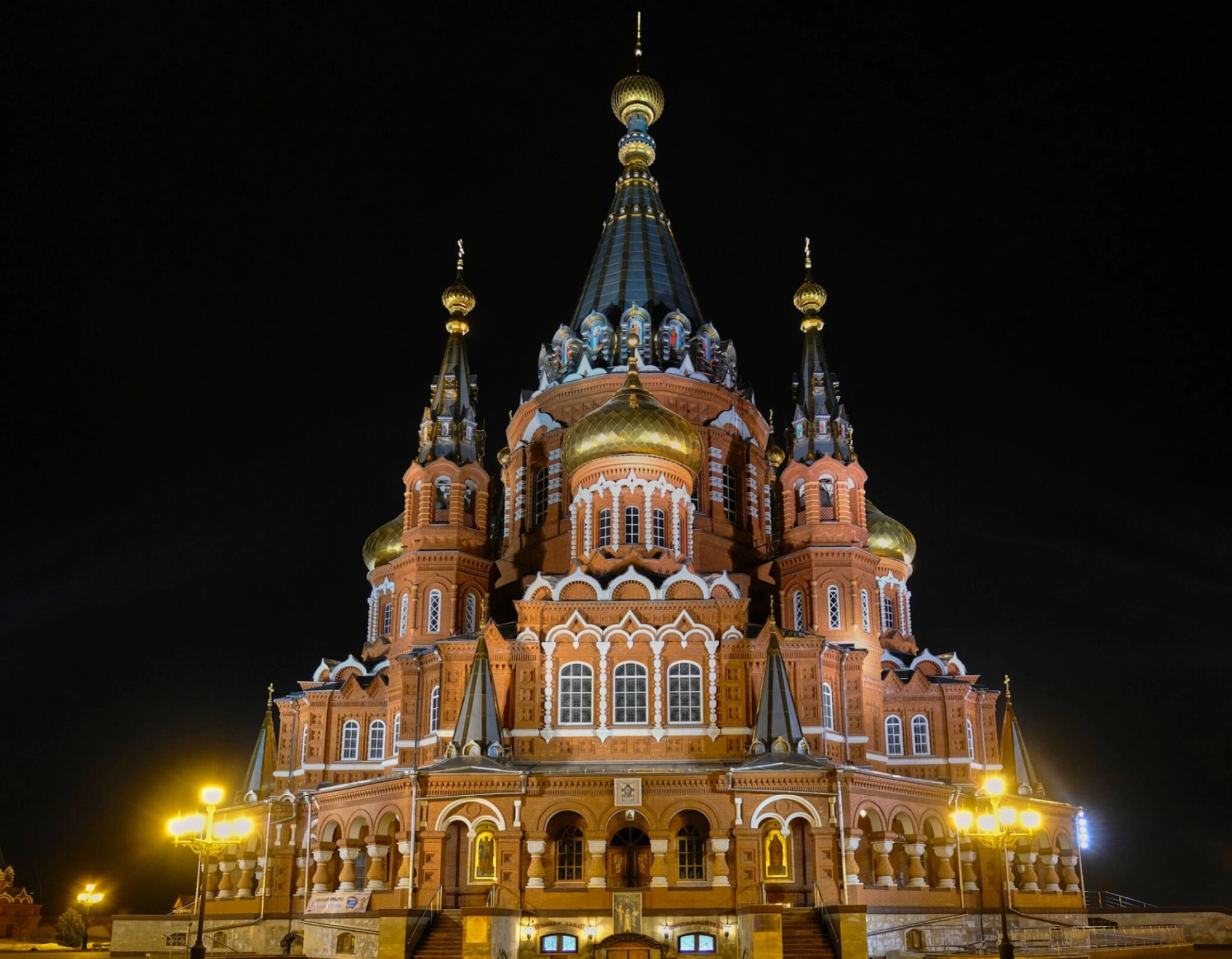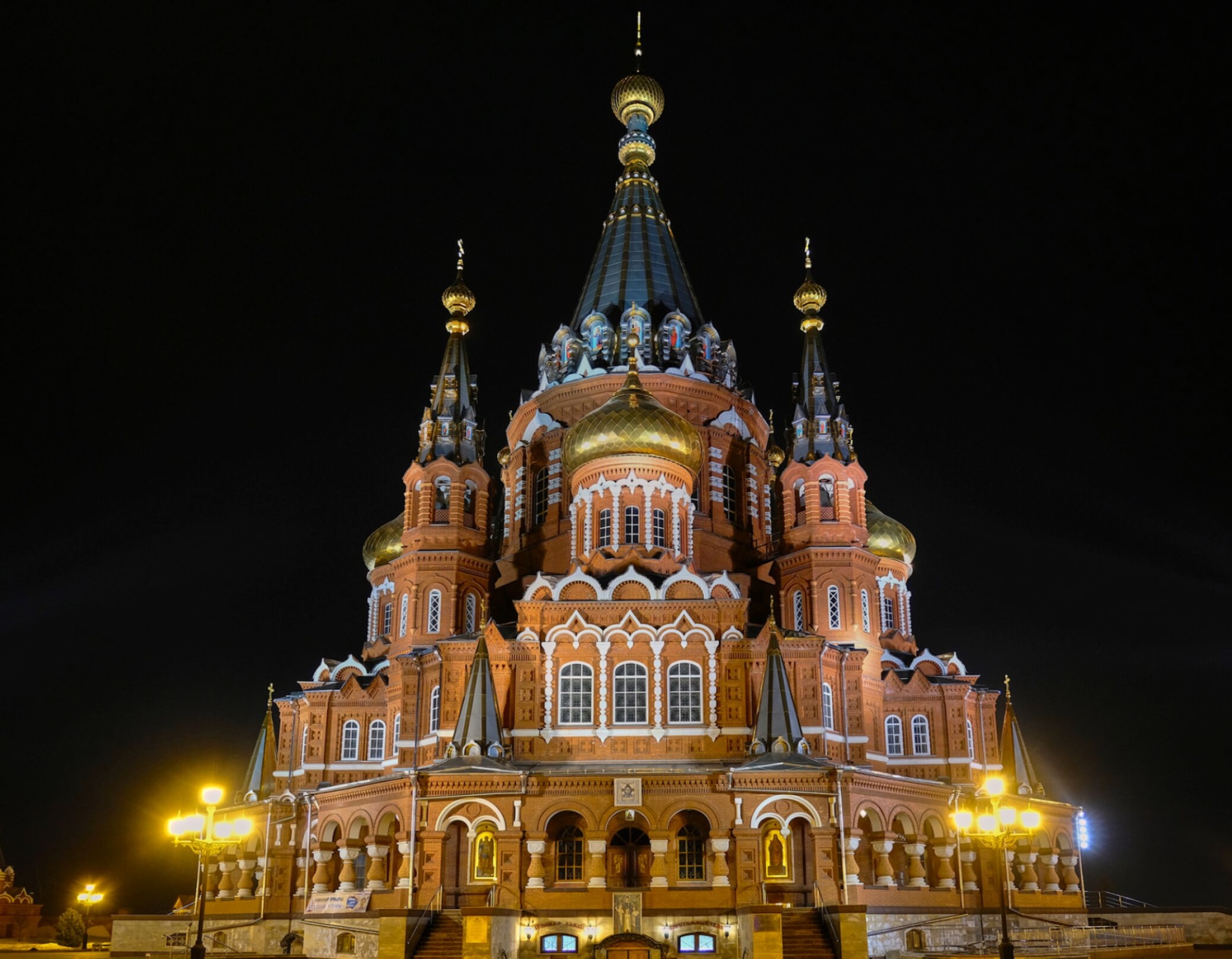 На представленной фотографии запечатлён величественный Свято-Михайловский кафедральный собор, расположенный в городе Ижевске Удмуртской Республики. Этот православный храм, освящённый в честь Архистратига Михаила, является одним из духовных символов всего Уральского региона.