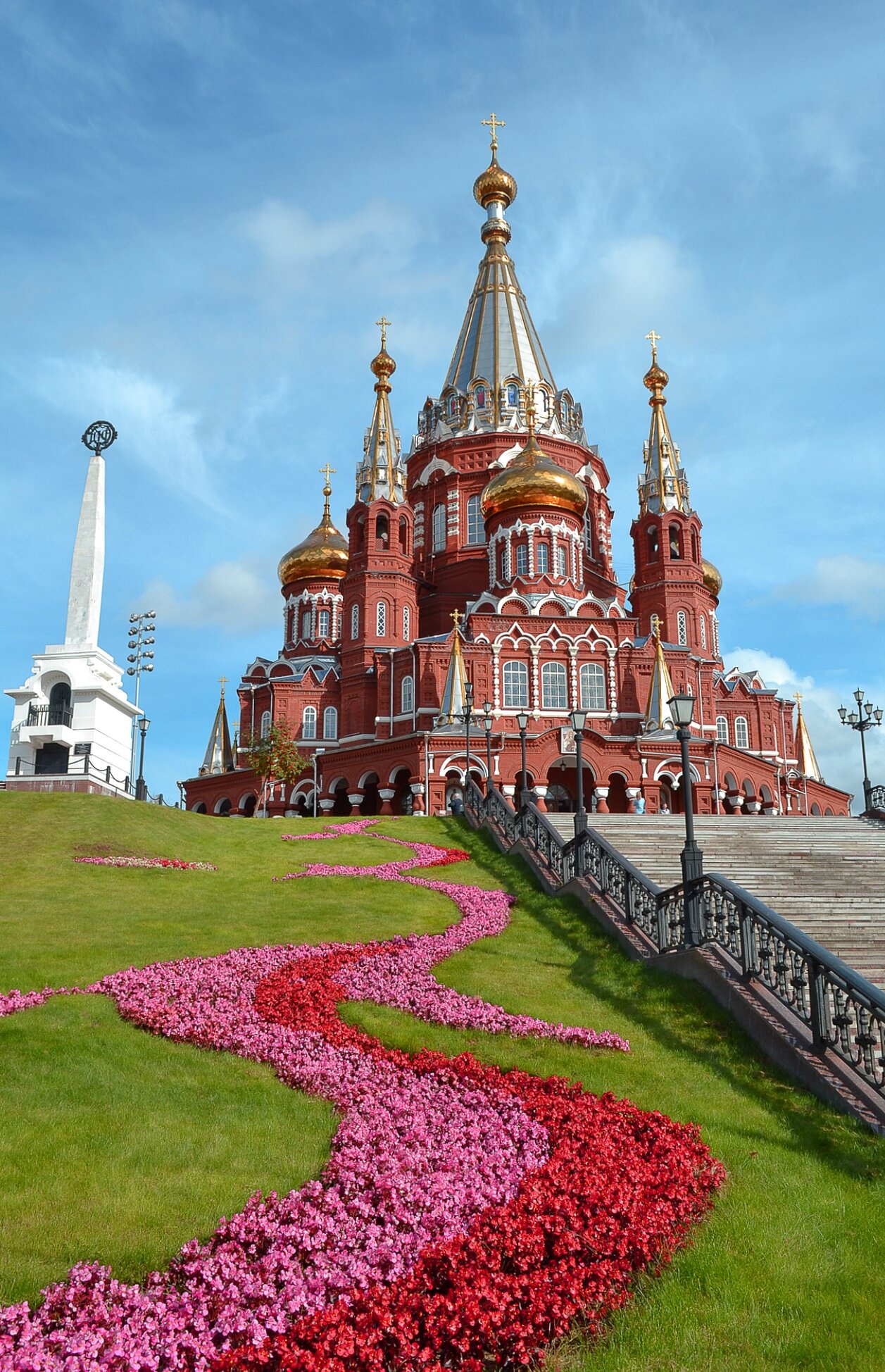 На фотографии запечатлён величественный Свято-Михайловский кафедральный собор, являющийся одной из главных православных святынь Ижевска и всей Удмуртской митрополии. Монументальный храм, возведённый из красного кирпича, увенчан сияющими золотыми куполами, которые символизируют горний мир и устремление верующих к Небесному Царству. Под ярким солнцем ясного дня златые главы и кресты сияют на фоне безмятежного голубого неба, создавая образ неземной красоты и благодати.