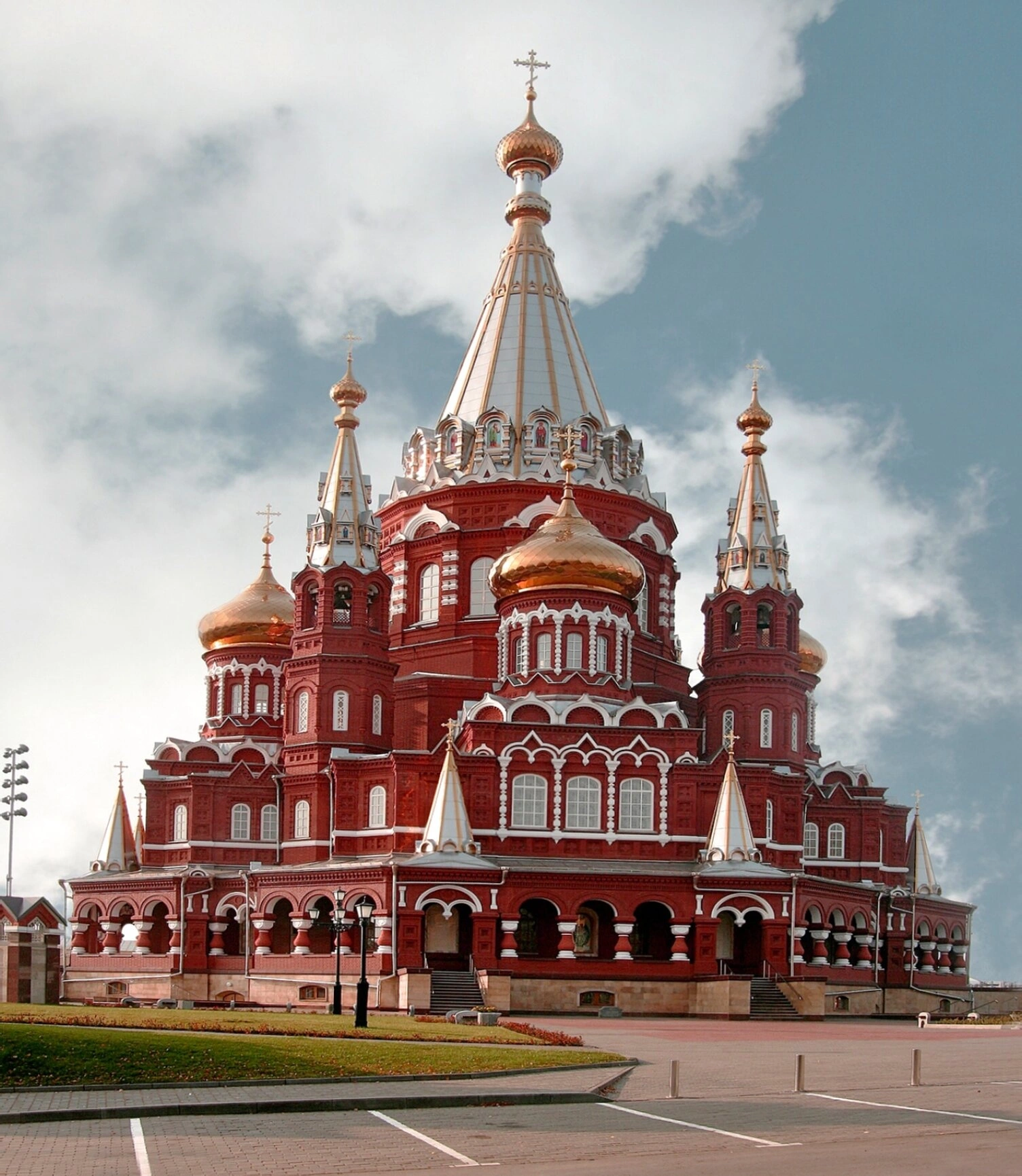 На представленной фотографии запечатлён величественный Свято-Михайловский собор, восставший из небытия на своей исторической родине — Красной горке в Ижевске. Этот кафедральный собор Ижевской и Удмуртской епархии является одним из духовных символов Удмуртии и ярчайшим образцом русского церковного зодчества.