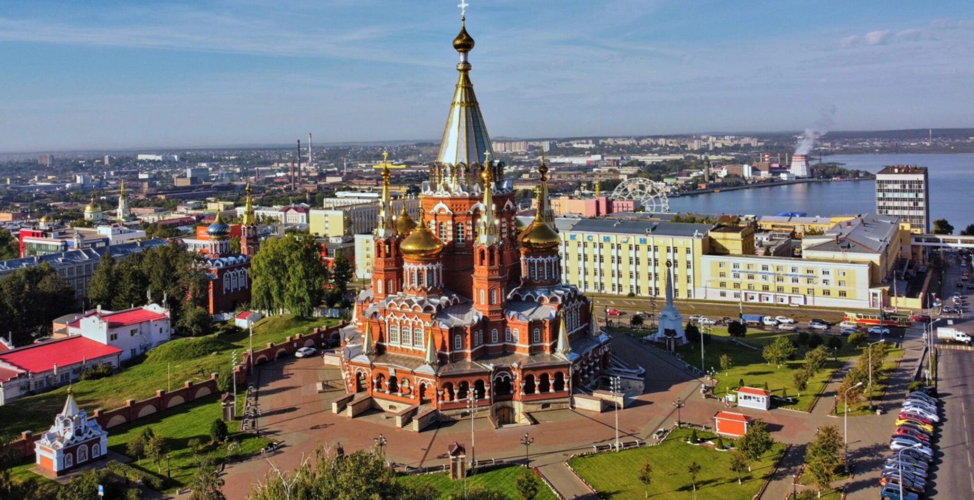 На представленной фотографии запечатлён величественный Свято-Михайловский собор, расположенный в самом сердце Ижевска на его наивысшей точке. Этот православный храм, освящённый в честь Архистратига Михаила, является духовным символом столицы Удмуртской Республики и важнейшей архитектурной доминантой города.