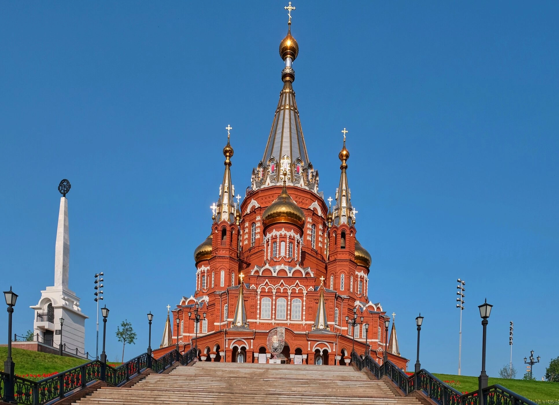 Белоснежный пятиглавый храм с золочёными куполами возвышается на самом высоком месте города, символизируя торжество православной веры. Его высота составляет более шестидесяти семи метров. На фотографии можно видеть монументальный классический фасад, украшенный колоннами и арками, а также стройную колокольню, увенчанную шпилем.