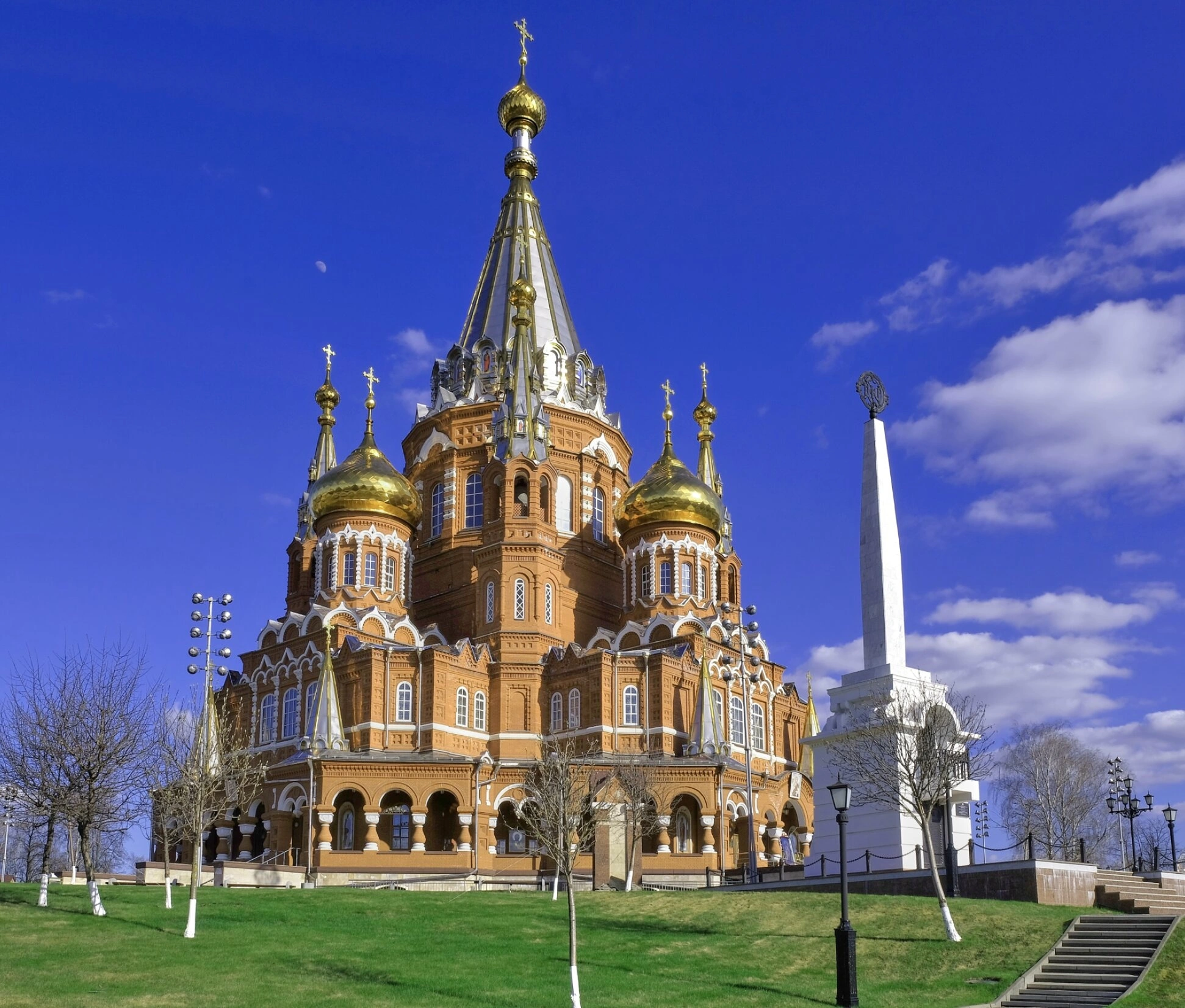 Снимок позволяет рассмотреть монументальное сооружение из красного кирпича с изящными белокаменными декоративными элементами. Собор располагается на возвышенности, что подчёркивает его доминирующее положение в городском пространстве и символизирует духовное восхождение. Перед храмом виднеется памятный обелиск, а ведущая к нему лестница олицетворяет путь верующего к Богу. Присутствующие на фото деревья без листвы указывают на период ранней весны или поздней осени, когда архитектурные формы читаются особенно отчётливо.