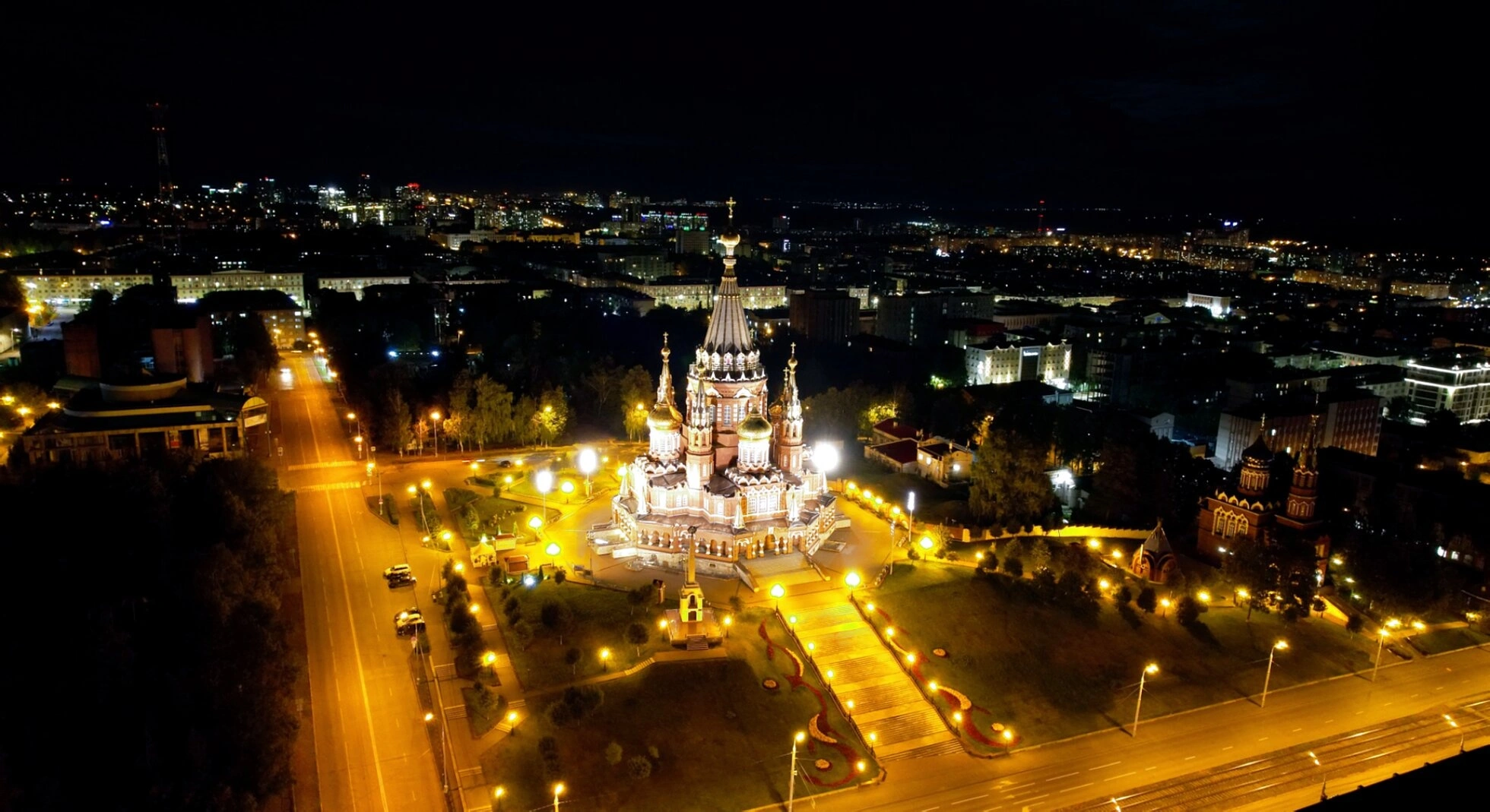 - Свято-Михайловский собор в Ижевске: ночной вид с высоты