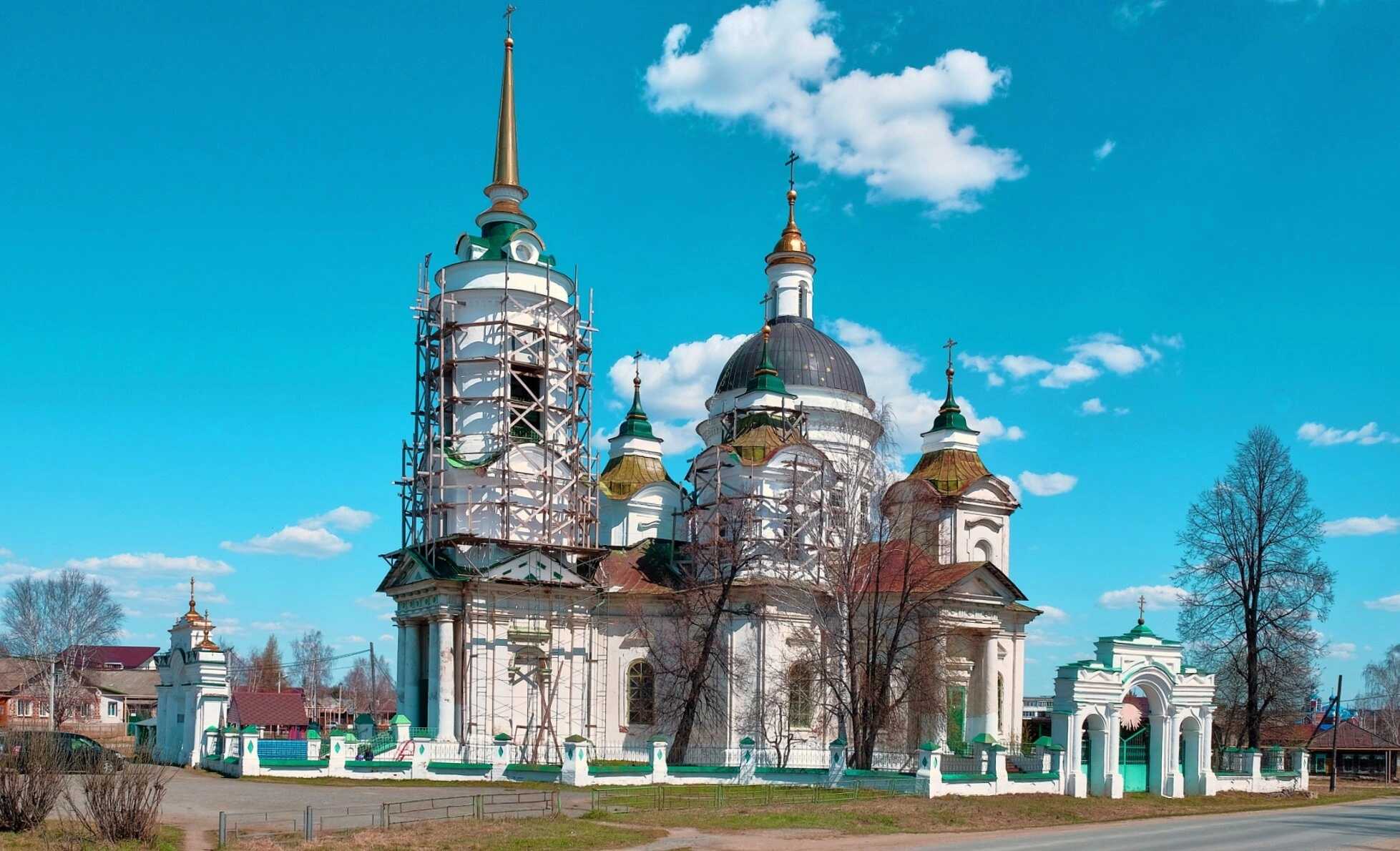 На момент съёмки храм пребывает в стадии реставрационных работ, о чём свидетельствуют установленные строительные леса на одной из глав и колокольне. Эти работы направлены на сохранение уникального памятника архитектуры и благоукрашение дома Божьего для будущих поколений верующих. Окружающий пейзаж с деревенскими домами и высокими деревьями подчёркивает гармоничное вписывание святой обители в природный ландшафт Среднего Урала.