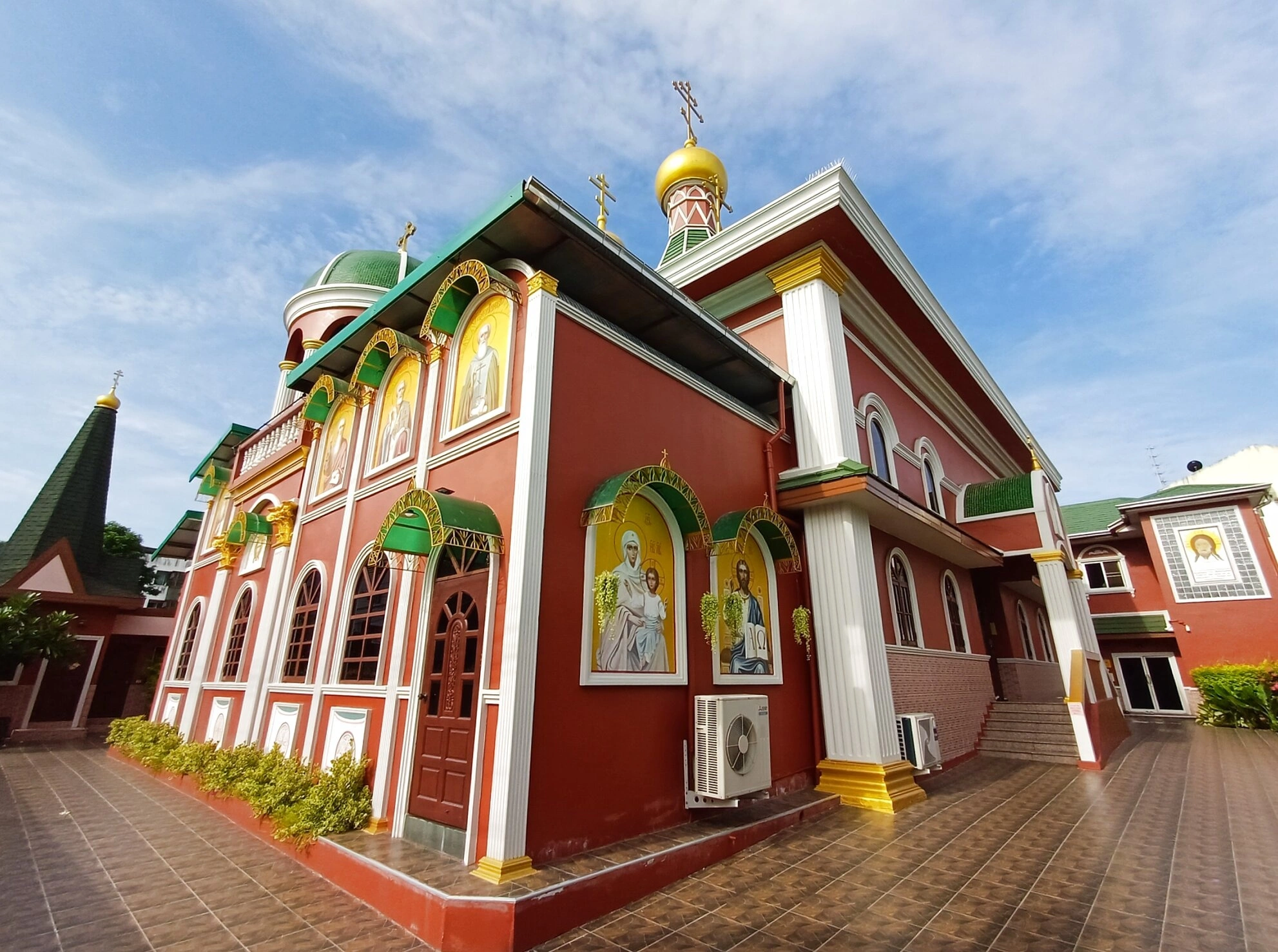 На фотографии запечатлён кафедральный собор Святителя Николая Чудотворца в Бангкоке, являющийся главным храмом Таиландской епархии Русской Православной Церкви. Собор был освящён в 2014 году и представляет собой пятикупольный шатровый храм, возведённый с учётом местных строительных норм.