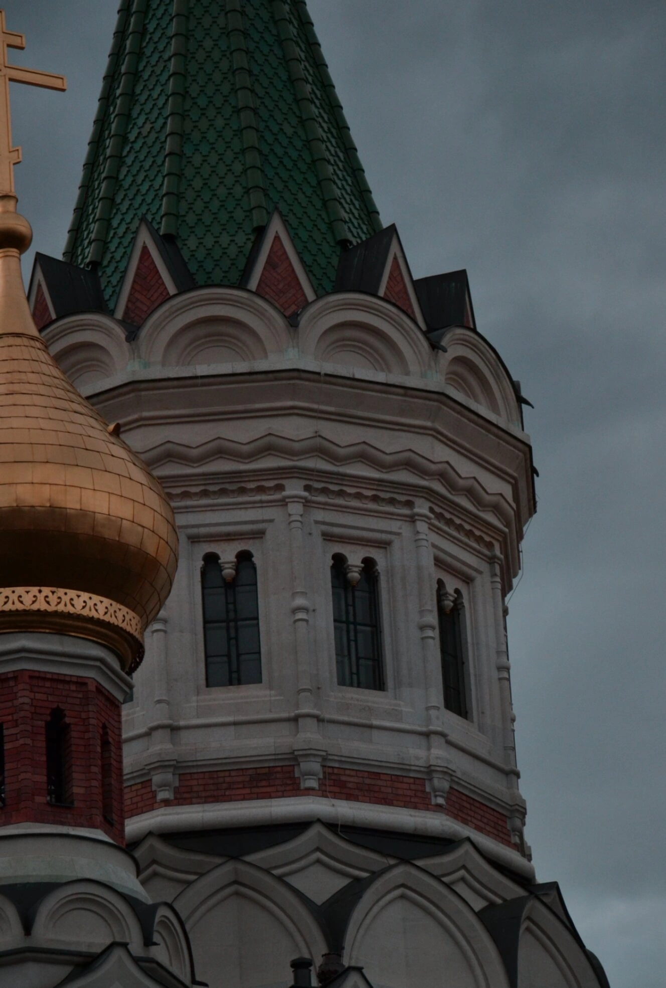 На фотографии запечатлён величественный Свято-Николаевский кафедральный собор в Вене, являющийся кафедральным храмом Венской и Австрийской епархии Русской Православной Церкви. Снимок сделан снизу вверх, что позволяет в деталях рассмотреть благолепие верхних частей святого храма.