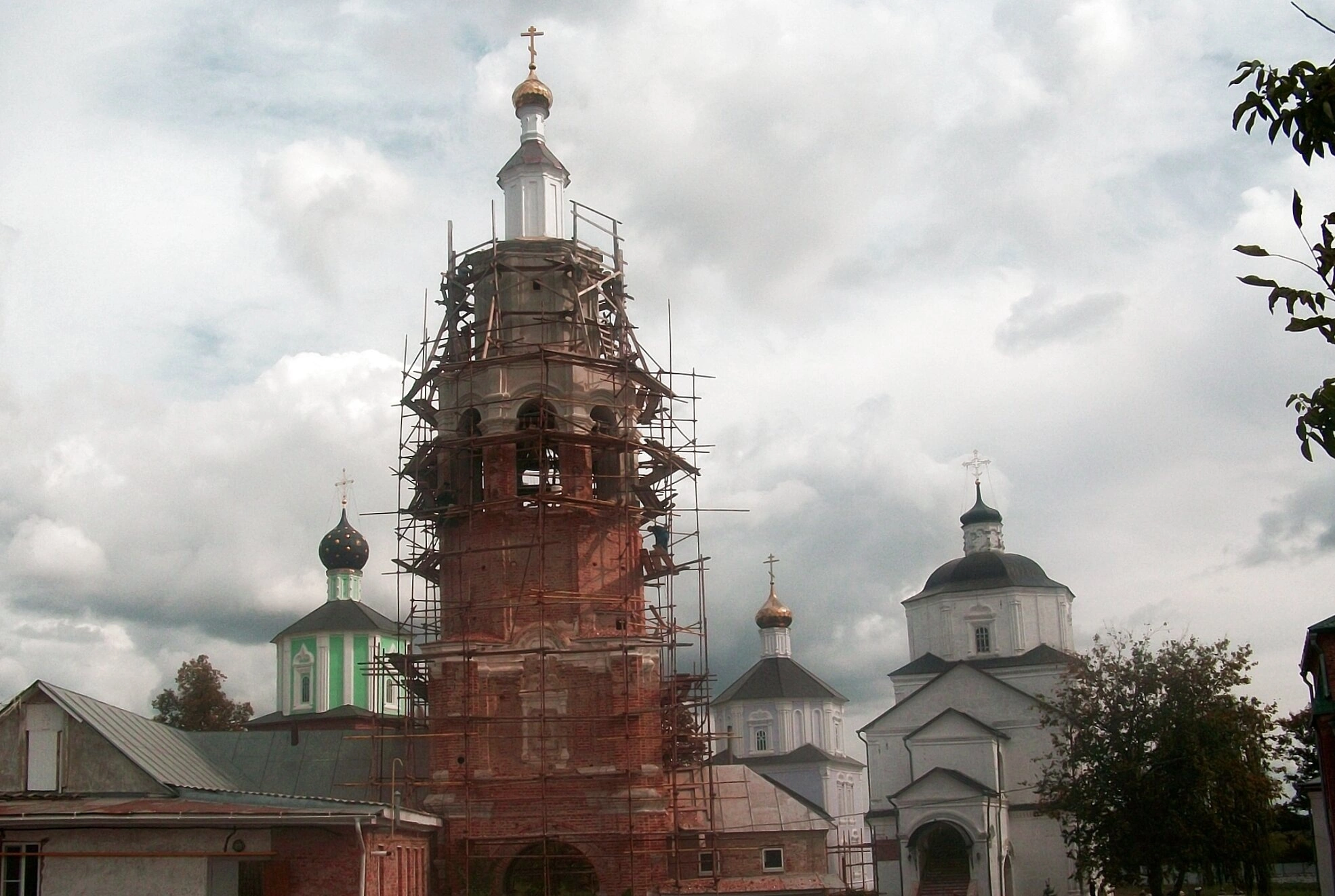 Архитектурный ансамбль монастыря, формировавшийся на протяжении нескольких веков, представляет огромную культурную и историческую ценность. Проводимые в настоящее время реставрационные работы являются продолжением заботы Русской Православной Церкви о сохранении национального духовного наследия для будущих поколений. Фотография captures момент этого благого труда, напоминая о непрерывности tradition of возрождения святынь на русской земле.