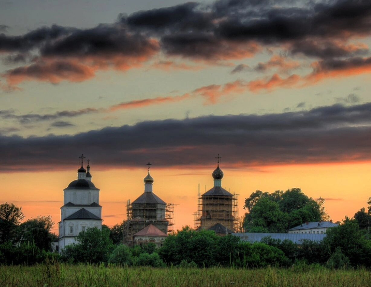 На представленной фотографии запечатлён величественный вид Рыльского Свято-Николаевского мужского монастыря в часы вечернего заката. Небесная сфера, окрашенная в пламенные оранжево-багряные тона, оттенённые тёмными облаками, служит благодатным фоном для святой обители, создавая атмосферу благоговейного покоя и вечности. Лучи уходящего солнца озаряют купола и стены храмов, словно напоминая о нетварном Фаворском свете.